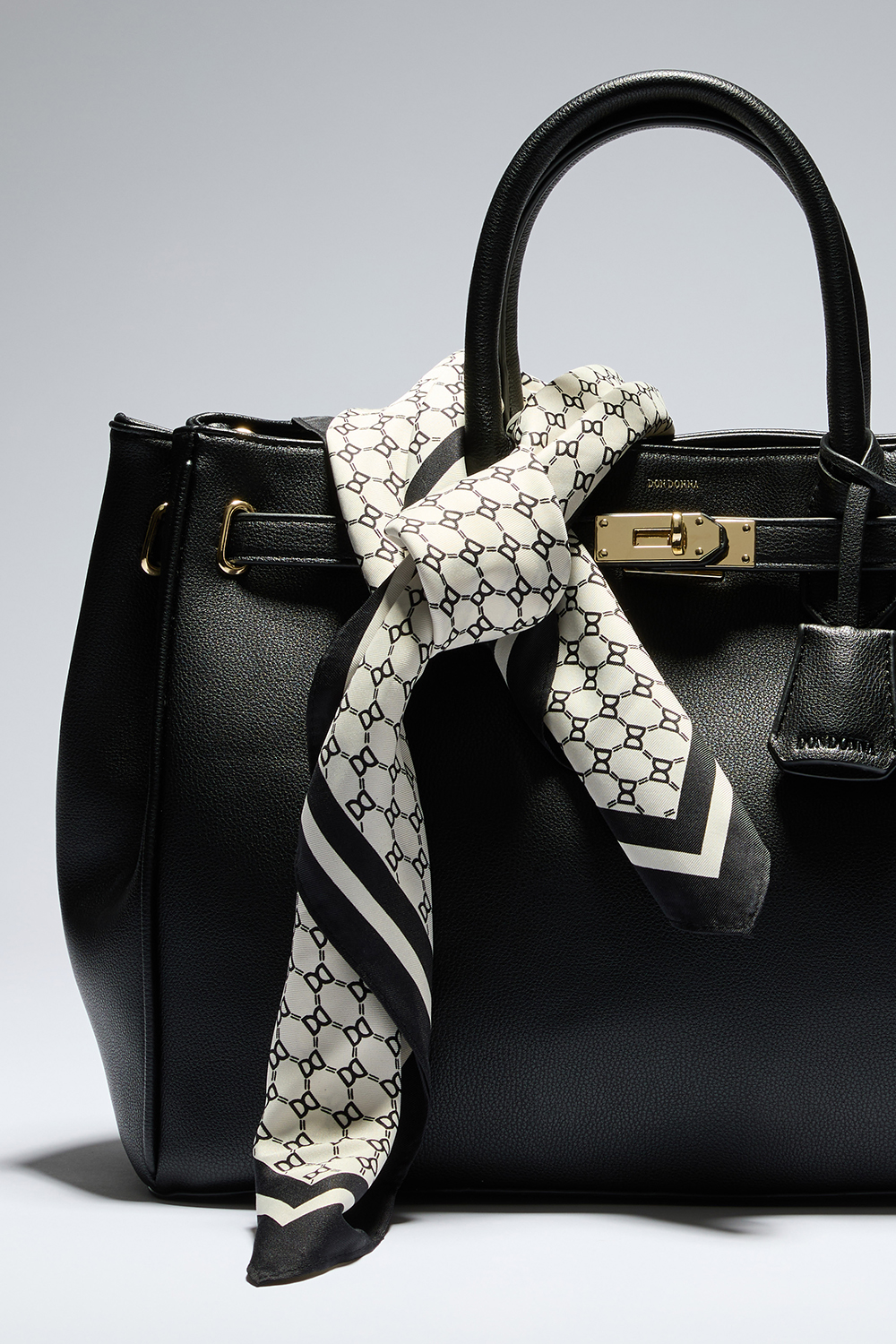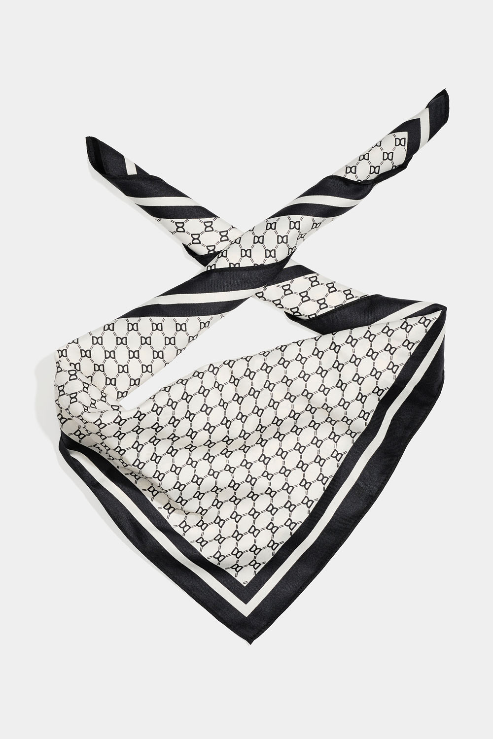 Kvadratisk scarf i sidenimitation med svart och vitt DD mönster och svart kant.