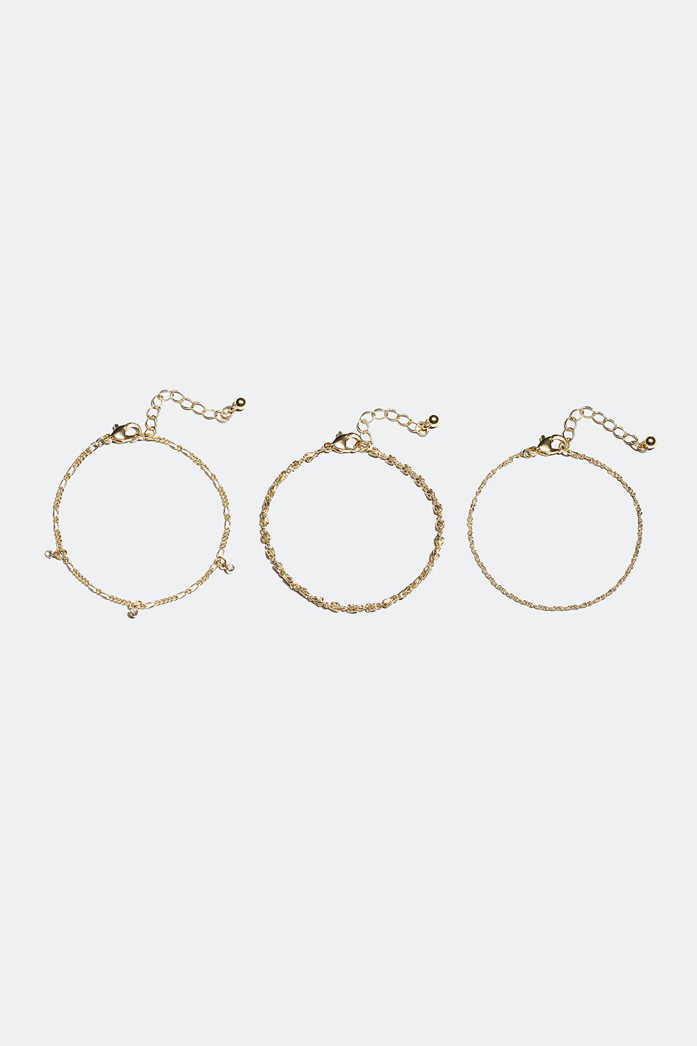3-pack med tunna länkarmband i metall med olika design på kedjorna och dekorativa glasstenar på ett av armbanden. Armbanden är fina att kombinera men går att använda separat, eller mixas med andra armband.