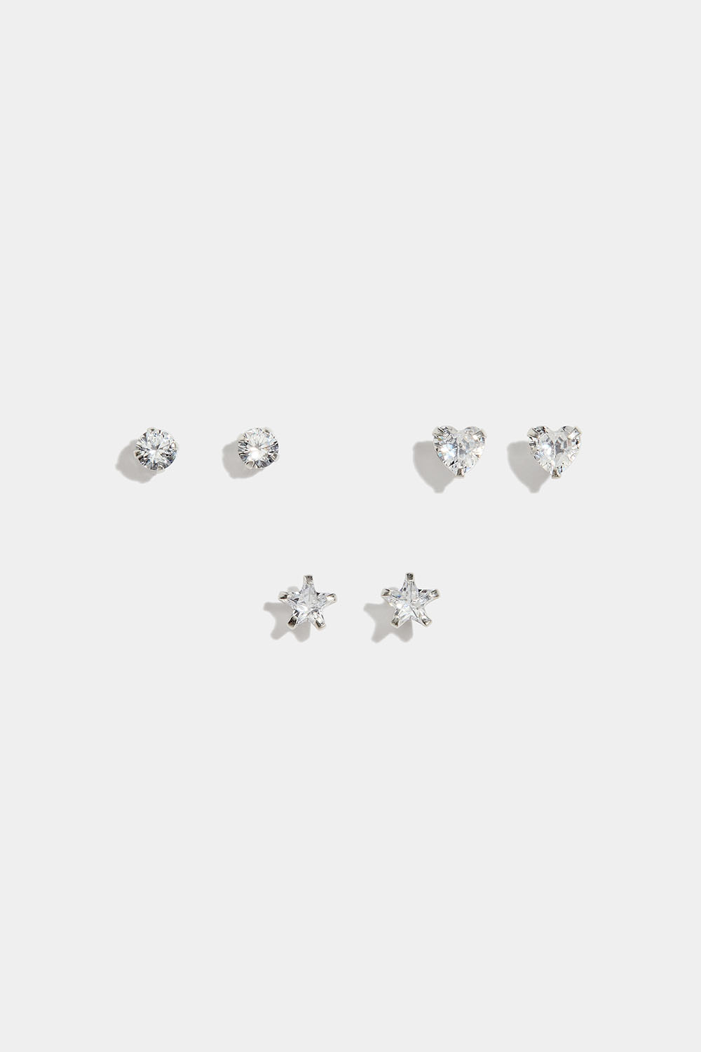 3-pack studs i äkta silver med stenar i Cubic Zirconia, utformade som hjärtan, stjärnor och klassiska runda stenar.
