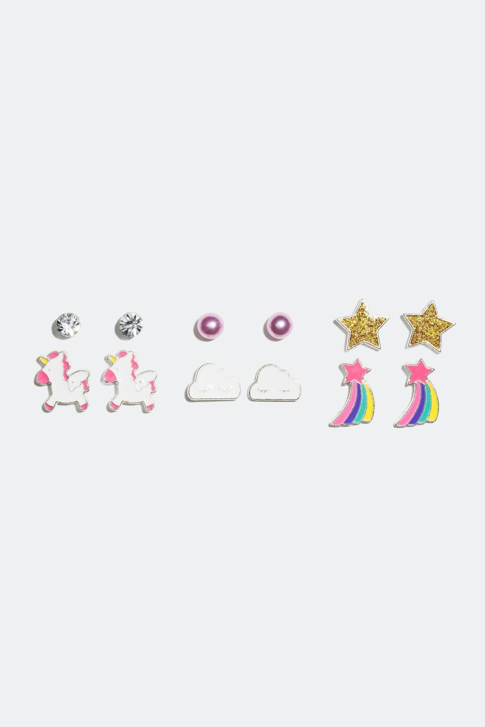6-pack färgglada örhängen för barn. Välj mellan små studs med moln, enhörningar och stjärnor eller mer enkla med glasstenar eller pärla.