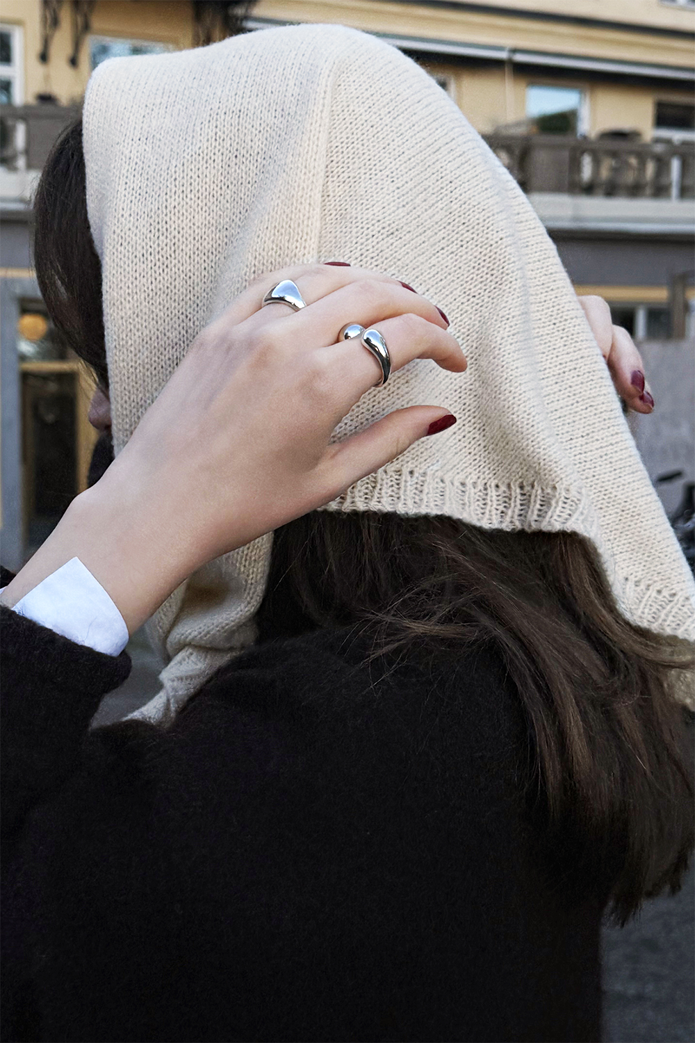 Benvit stickad trekantsformad scarf med ribbstickade kanter.