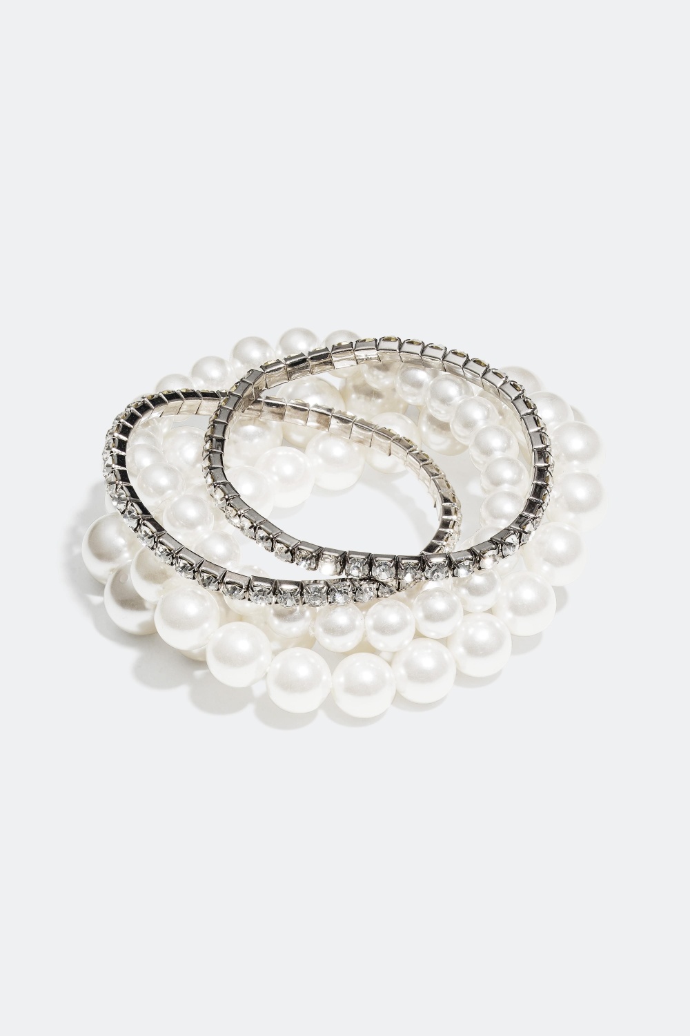 5-pack armband med tre vita pärlarmband med plastpärlor och två silverfärgade strassarmband med vita glasstenar.