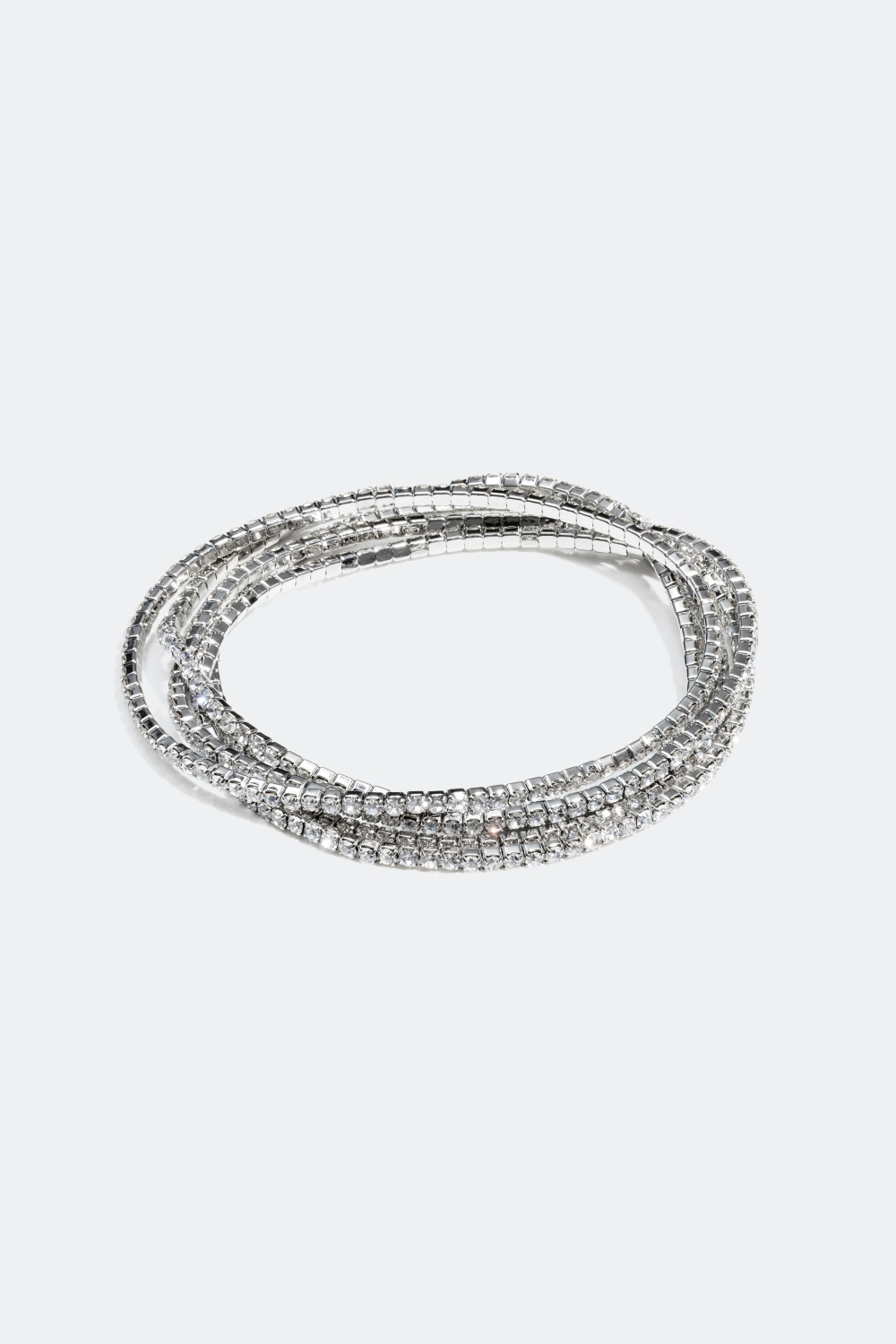 5-pack silverfärgade strassarmband med vita glasstenar. Bär armbanden alla tillsammans, var för sig eller kombinera exempelvis två på ena armen och tre på andra. Fina strassarmband som kan bäras på ditt sätt!