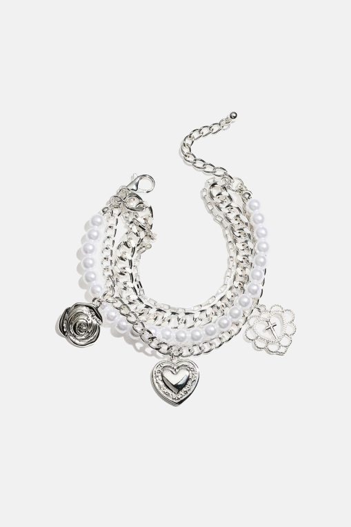 Armband med tre kedjor i olika design och en pärllänk. Armbandet har tre hängande berlocker i form av hjärtan och en ros.