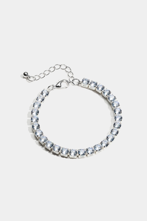 Armband i silverfärgad metall med fyrkantiga vita glasstenar längs med.