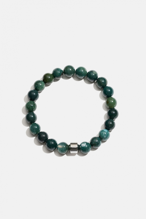 Elastiskt armband med runda 'green jasper' naturstenar med polerad finish och en pärldetalj i rostfritt stål. Ett stilrent armband som passar perfekt att kombinera med flera armband. Kommer i storlekarna S/M och M/L.