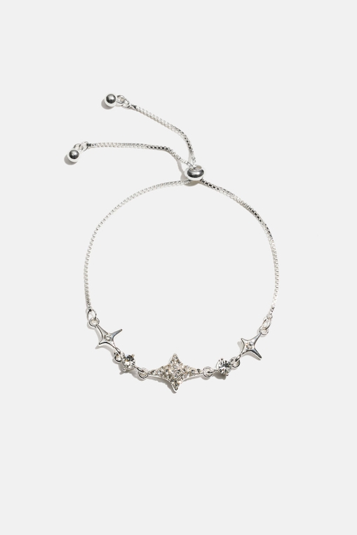 Armband med tunn kedja dekorerad med stjärnor och små glasstenar. Längden är justerbar med hjälp av en gummerad silverpärla.