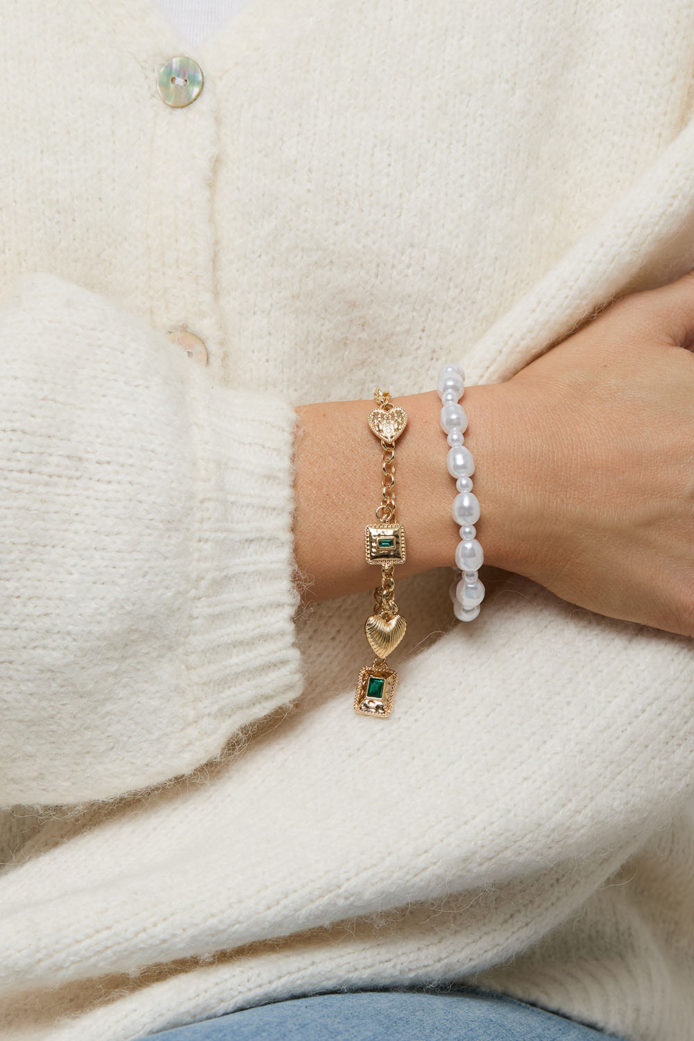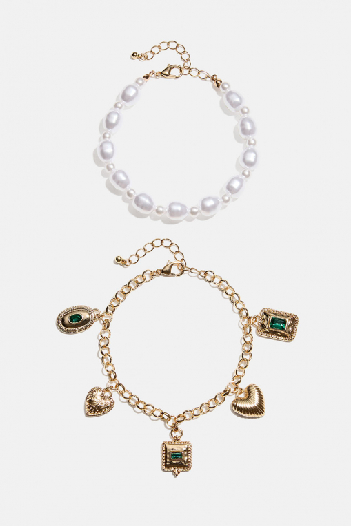 2-pack med armband. Ett med vita pärlor i olika form, och ett armband i guldfärgad metall med olika berlocker med gröna detaljer.