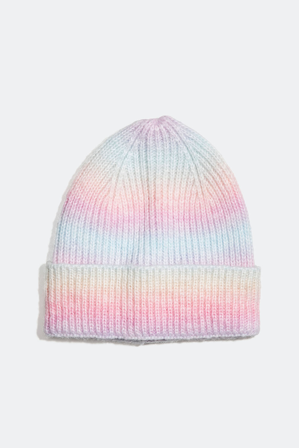 Ribbstickad barnmössa i ljusa regnbågsfärger.