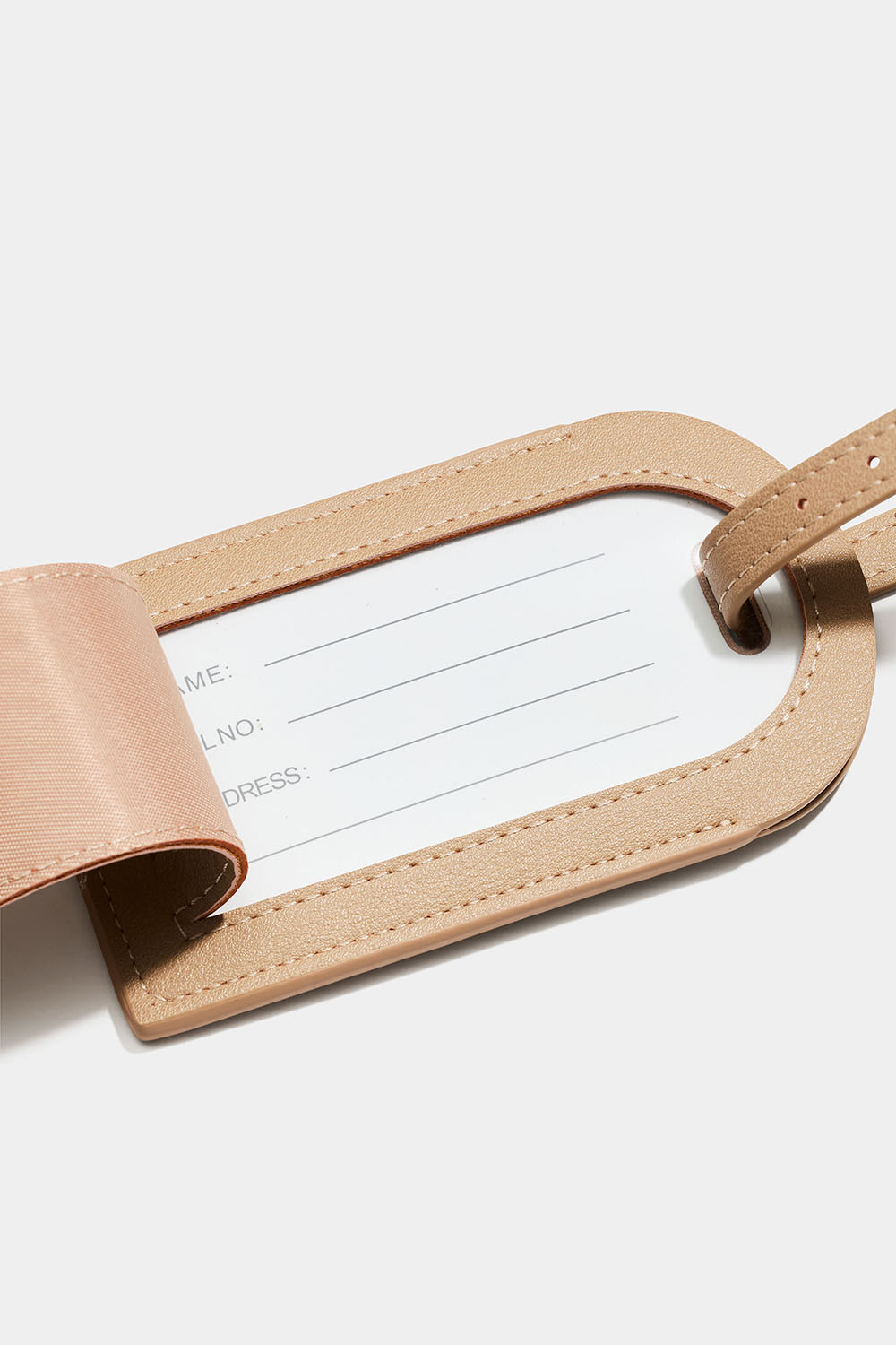 Beige bagagetag i imitationsläder som fästs på din väska. Inuti kan du skriva dina uppgifter på den medföljande adresslappen.