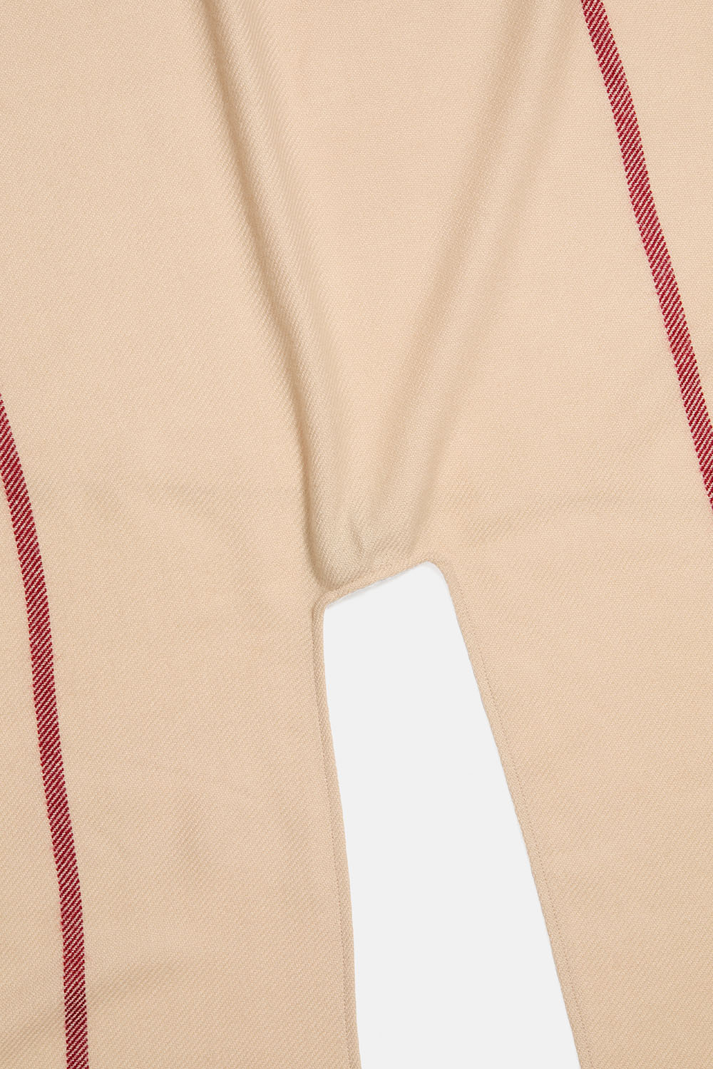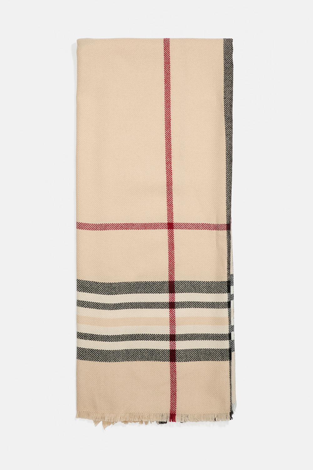 Beige poncho med fransar med rutigt mönster i svart och rött.