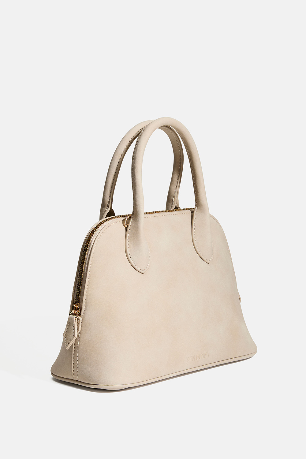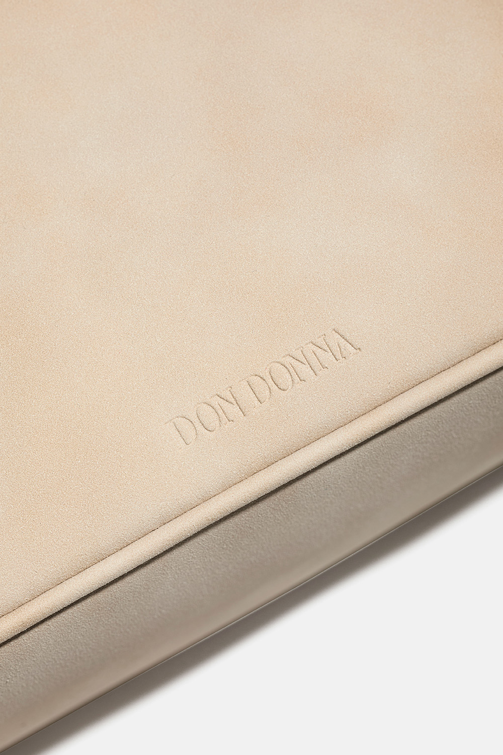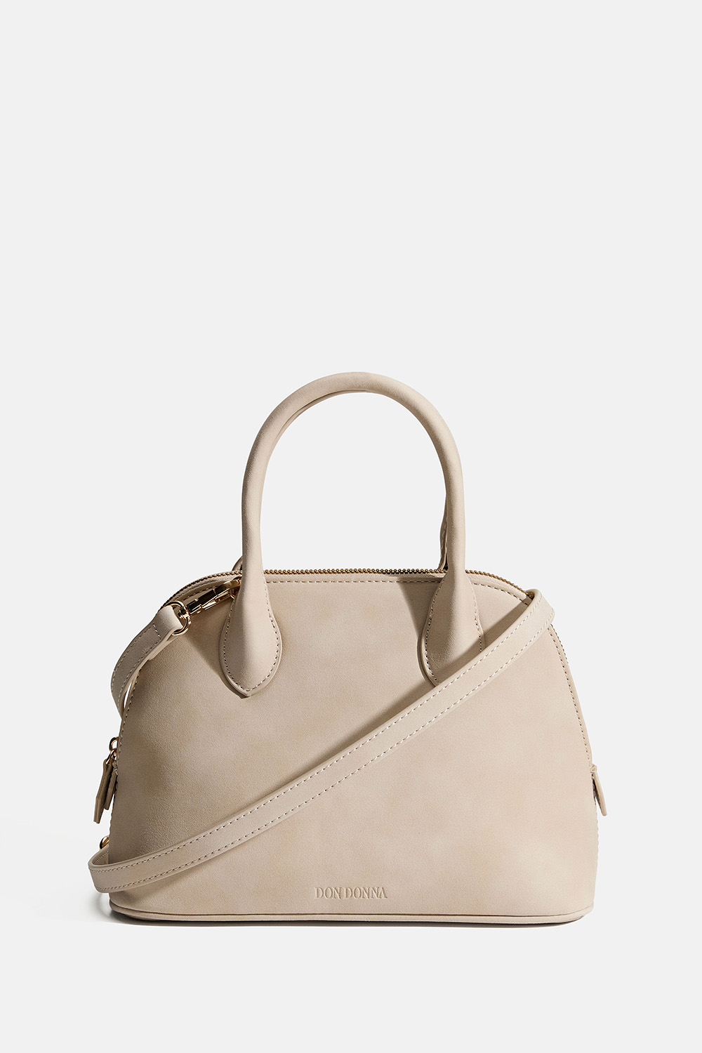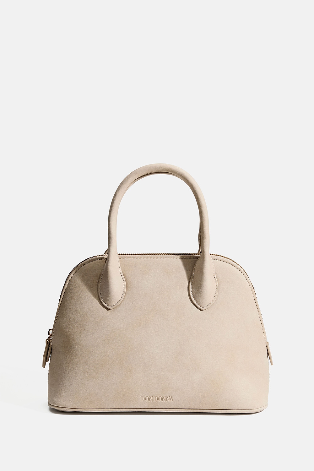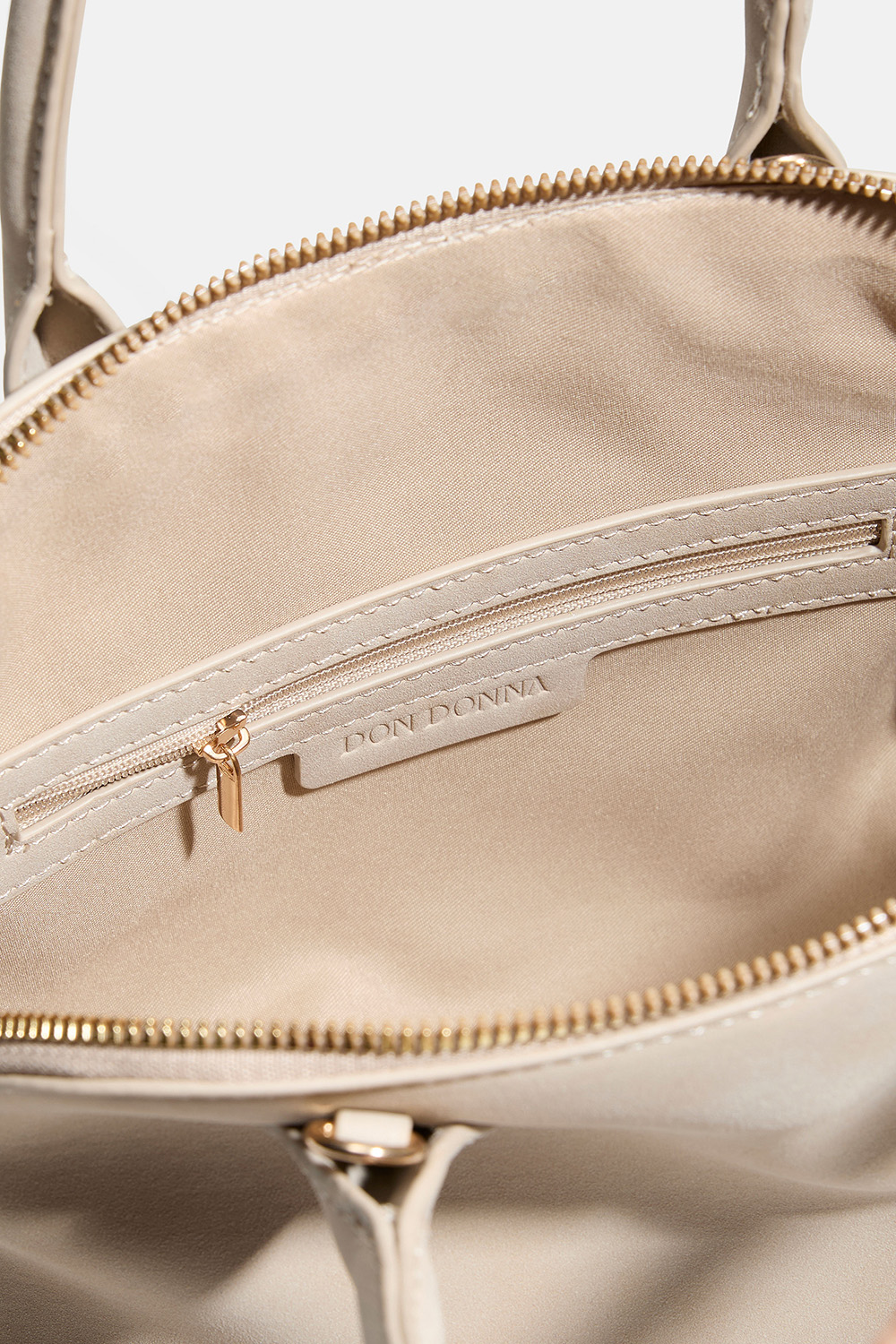Beige handväska I mockaimitation med två handtag och Don Donna logga. Väskan har ett stor fack och ett mindre på insidan, båda stängs med dragkedja. Det medföljer en justerbar axelrem.