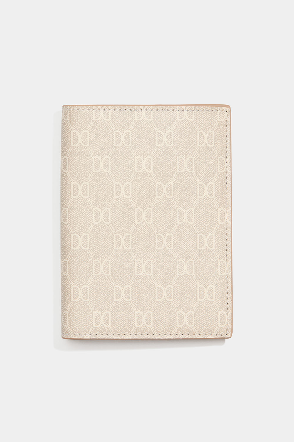 Beiget fodral med DD mönster för pass i imitationsläder. På insidan finns även fyra stycken fack för kort.