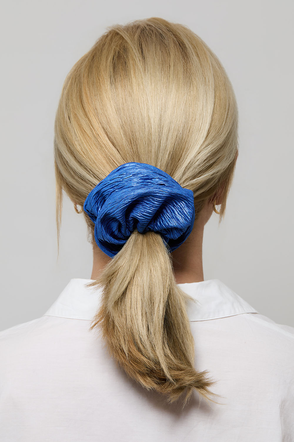 Blå scrunchie i glansigt plisserat tyg.
