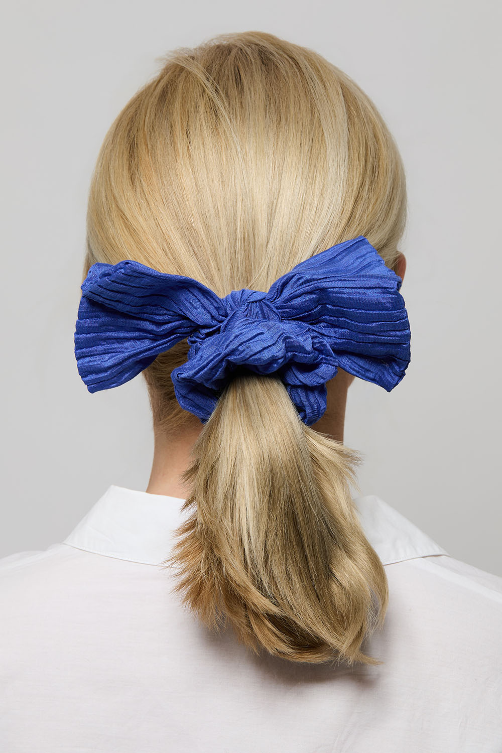 Blå plisserad scrunchie med stor rosett.