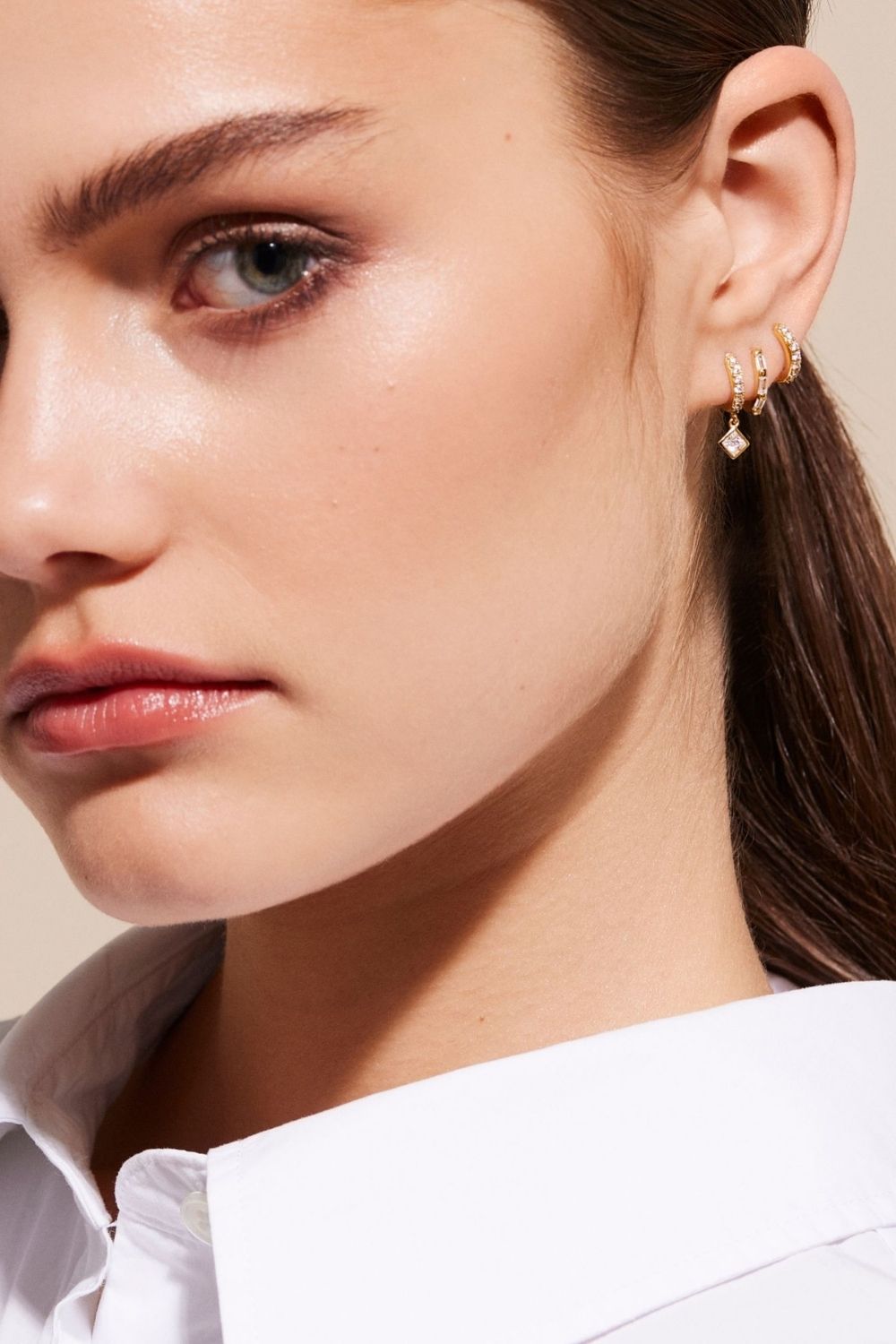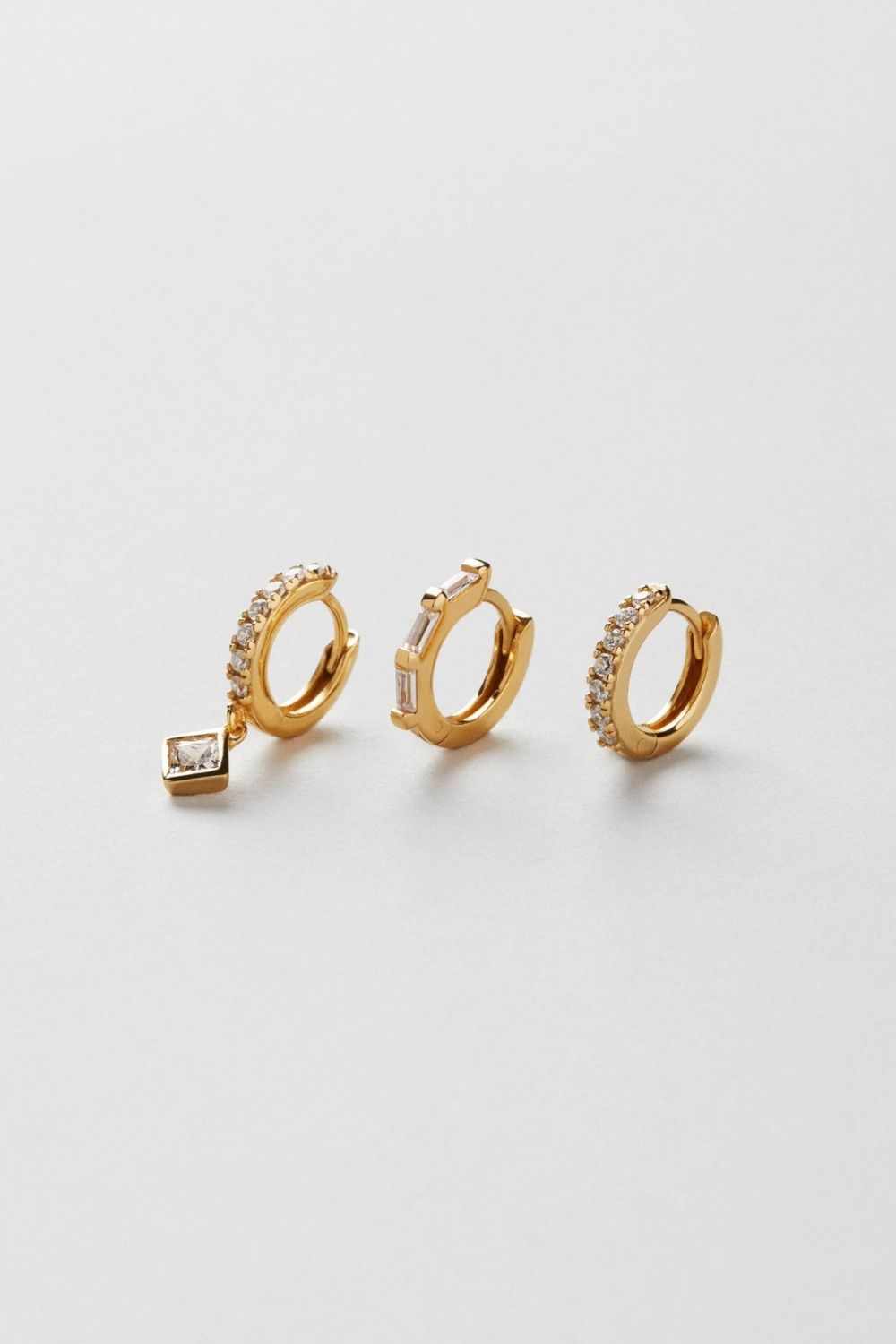 3-pack single hoops dekorerade med klara Cubic Zirconia stenar i olika former, förgyllda med äkta 18k guld och har en kärna av äkta sterling silver 925.