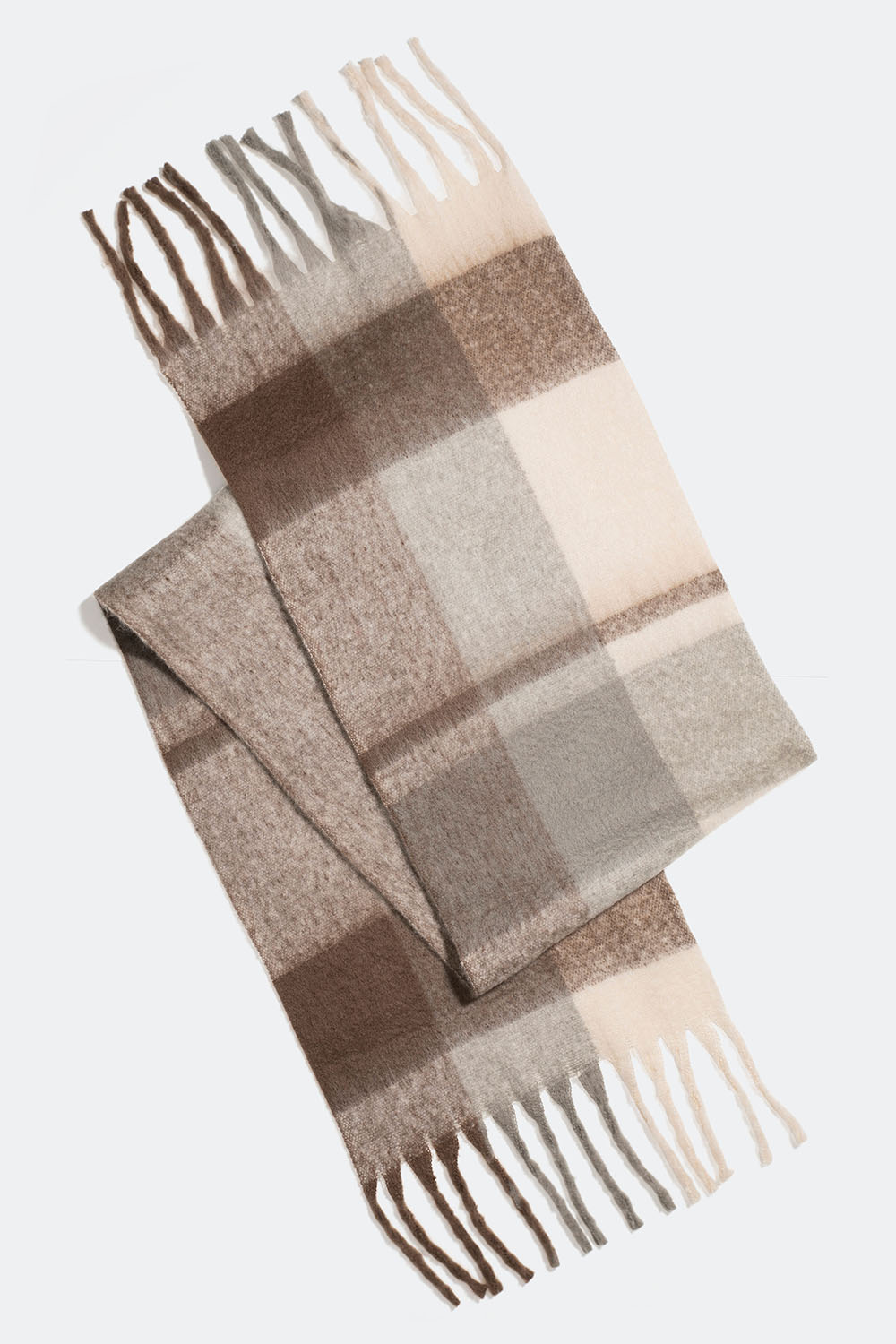 Stor halsduk i mjuk kvalitet med borstad yta. Halsduken kommer i en mix av beige och bruna toner i rutigt mönster och har långa fransar på kortsidorna.