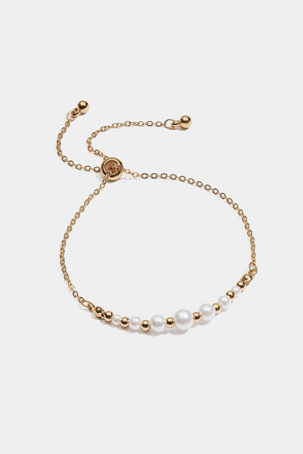 Armband med tunn kedja dekorerad med vita och guldiga pärlor. Längden är justerbar med hjälp av en gummerad guldpärla.