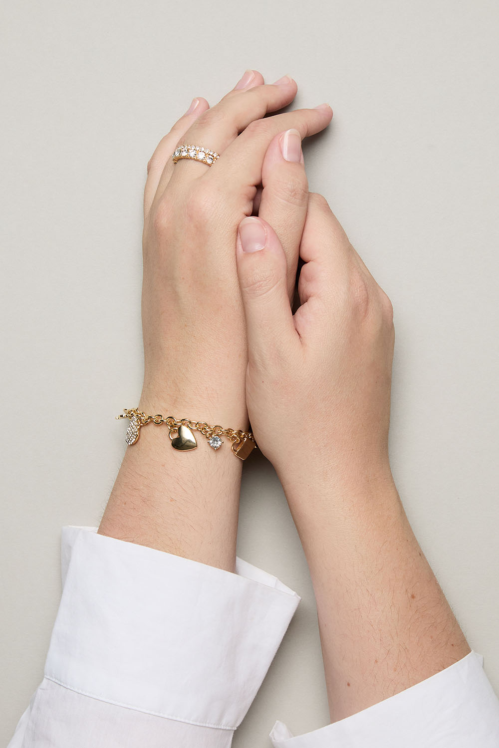 Grovt kedjearmband med hängande berlocker i form av hjärtan och nycklar.