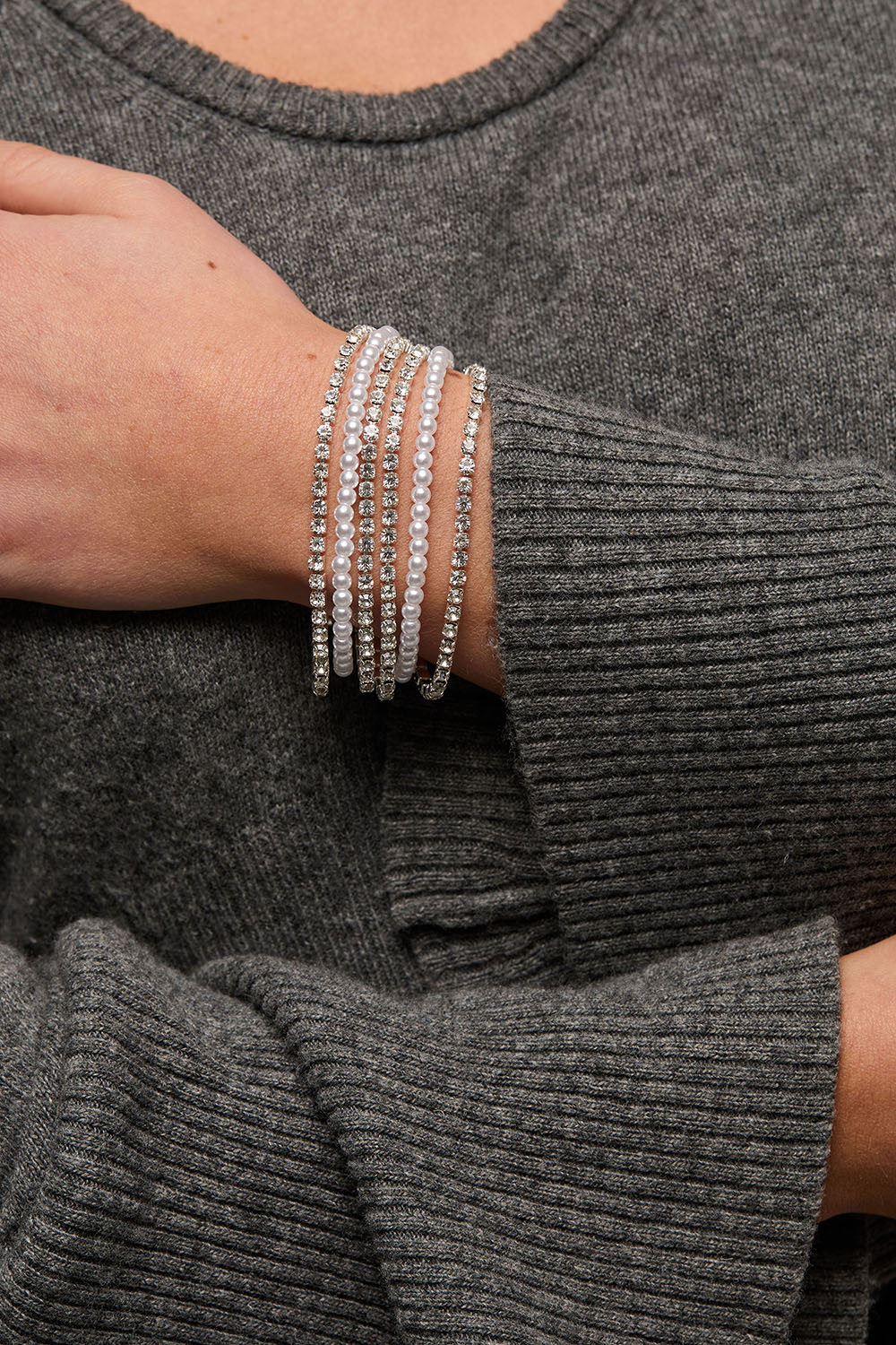 Brett armband i silverfärgad metall med strasslänkar och vita pärlor.