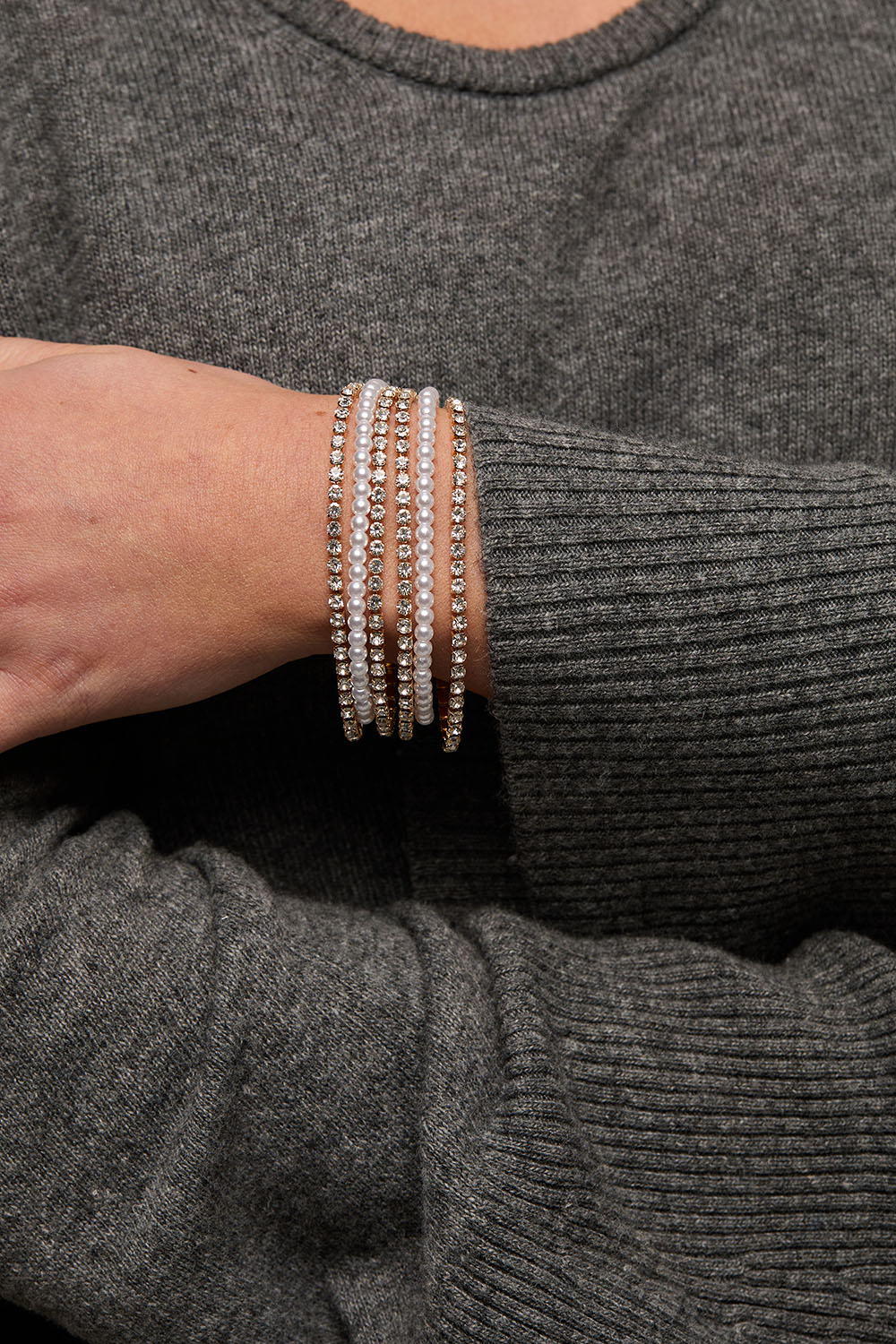 Brett armband i guldfärgad metall med strasslänkar och vita pärlor.