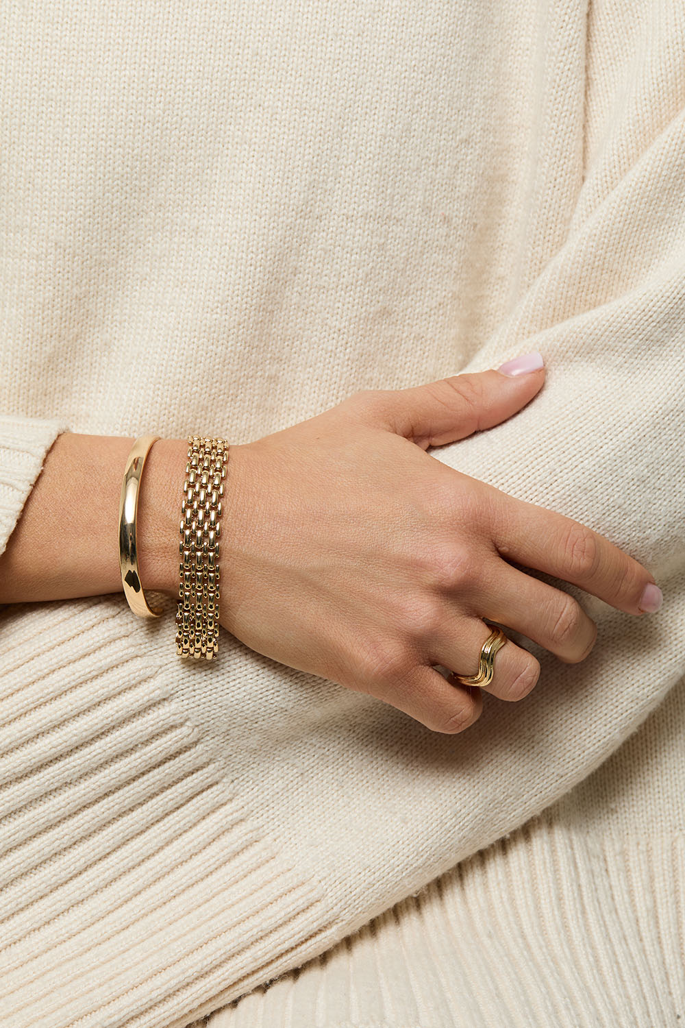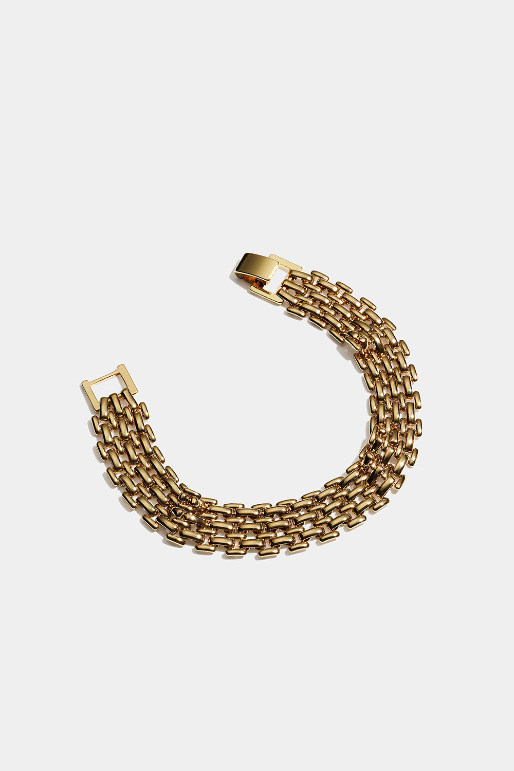 Brett armband i guldfärgad metall med platt stilren kedja.