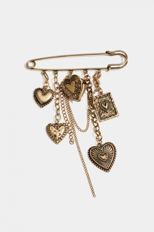Dekorativ brosch med stor säkerthetsnål i guldfärgad metall. Kommer med fler olika hängande hjärtan och kedjor.