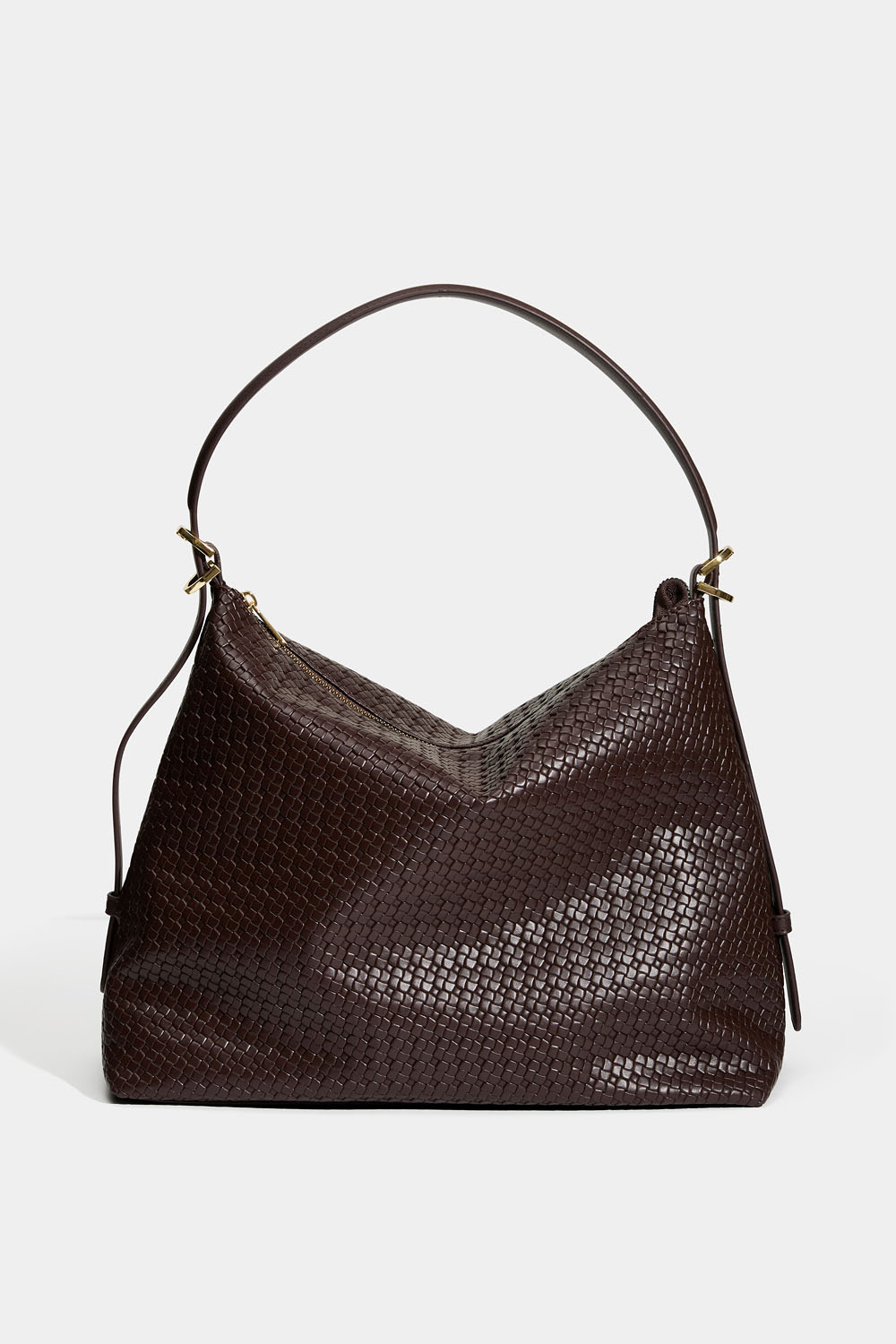 Brun väska i hobo-stil med vävd textur och justerbar axelrem. Väskan stängs med dragkedja och har ett mindre fack på insidan.