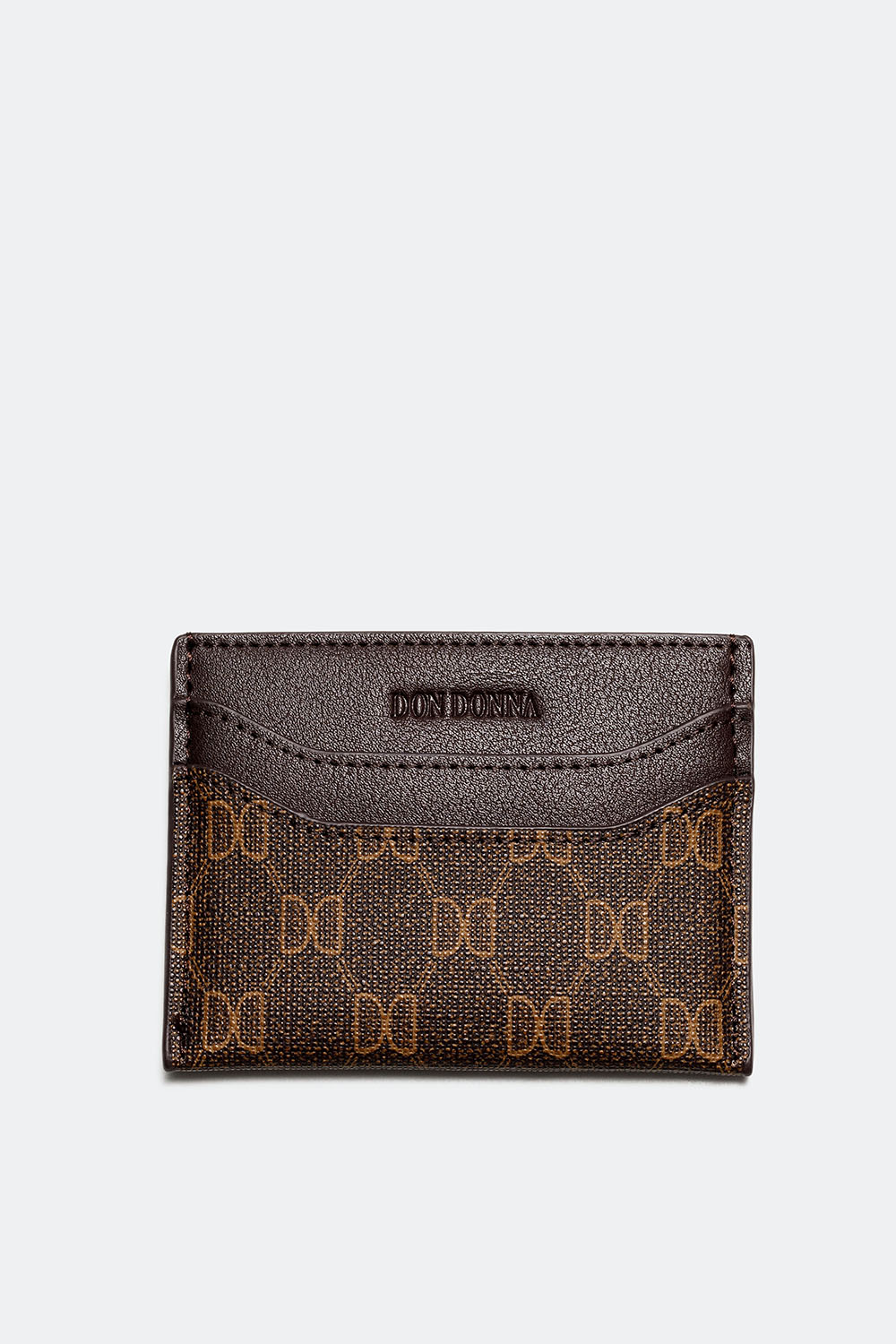 Korthållare i brun läderimitation med Don Donna-loggan printad. Praktisk liten plånbok med två fack på var sin sida och ett lite större fack i mitten för antingen flera kort, kvitton eller sedlar. En stilren korthållare med dekorativt mönster i perfekt storlek för dina viktigaste kort. Perfekt att matcha med våra Don Donna väskor.