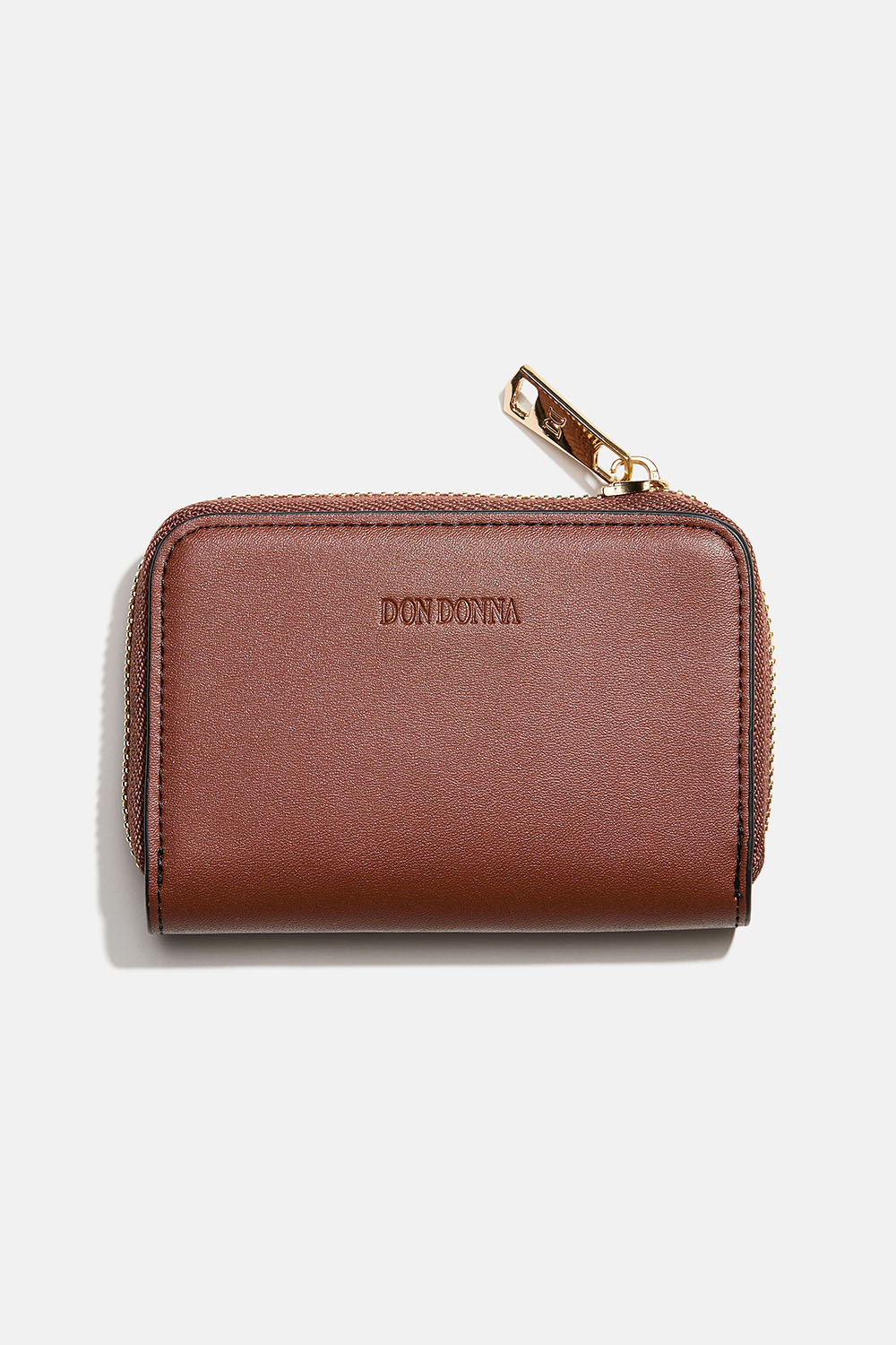 Plånbok i brun läderimitation för kort och sedlar med Don Donna-loggan präglad på framsidan. Praktisk liten plånbok med små fack för kort. Plånboken stängs med hjälp av en dragkedja vilket håller innehållet säkert på plats. Stilren plånbok som passar perfekt att matcha med våra Don Donna väskor.
