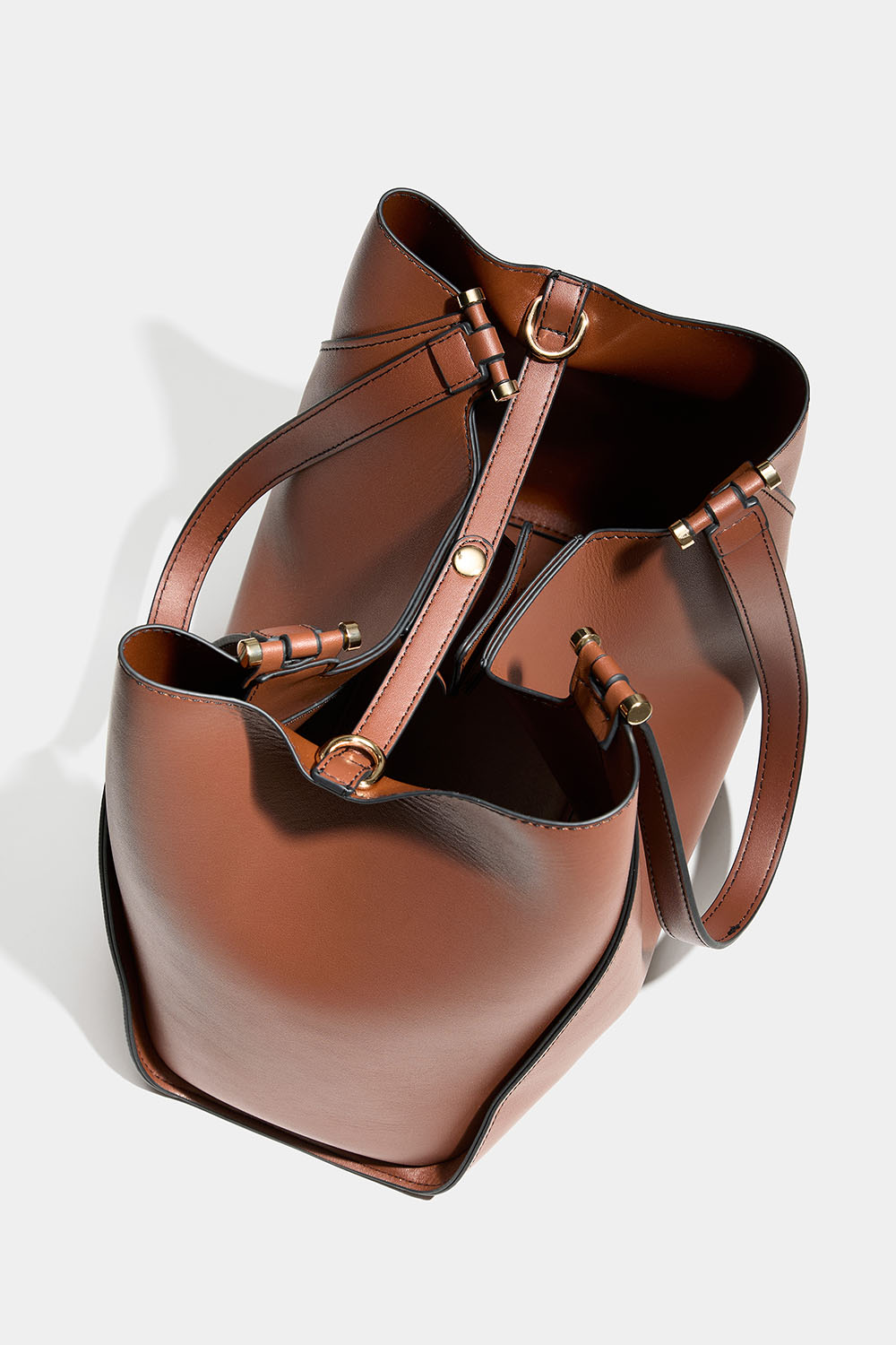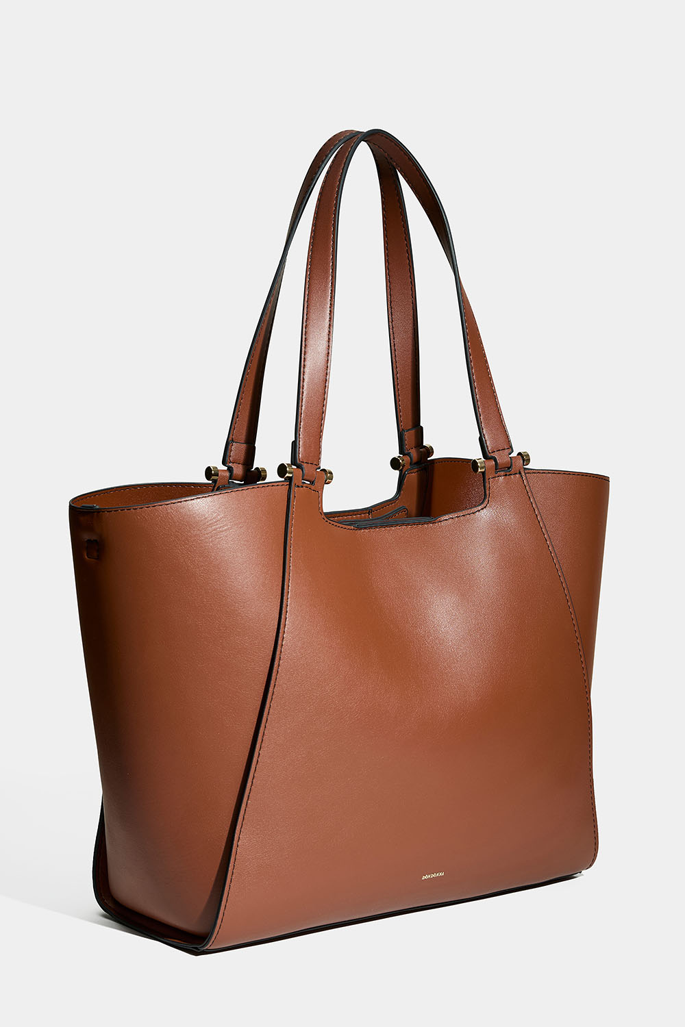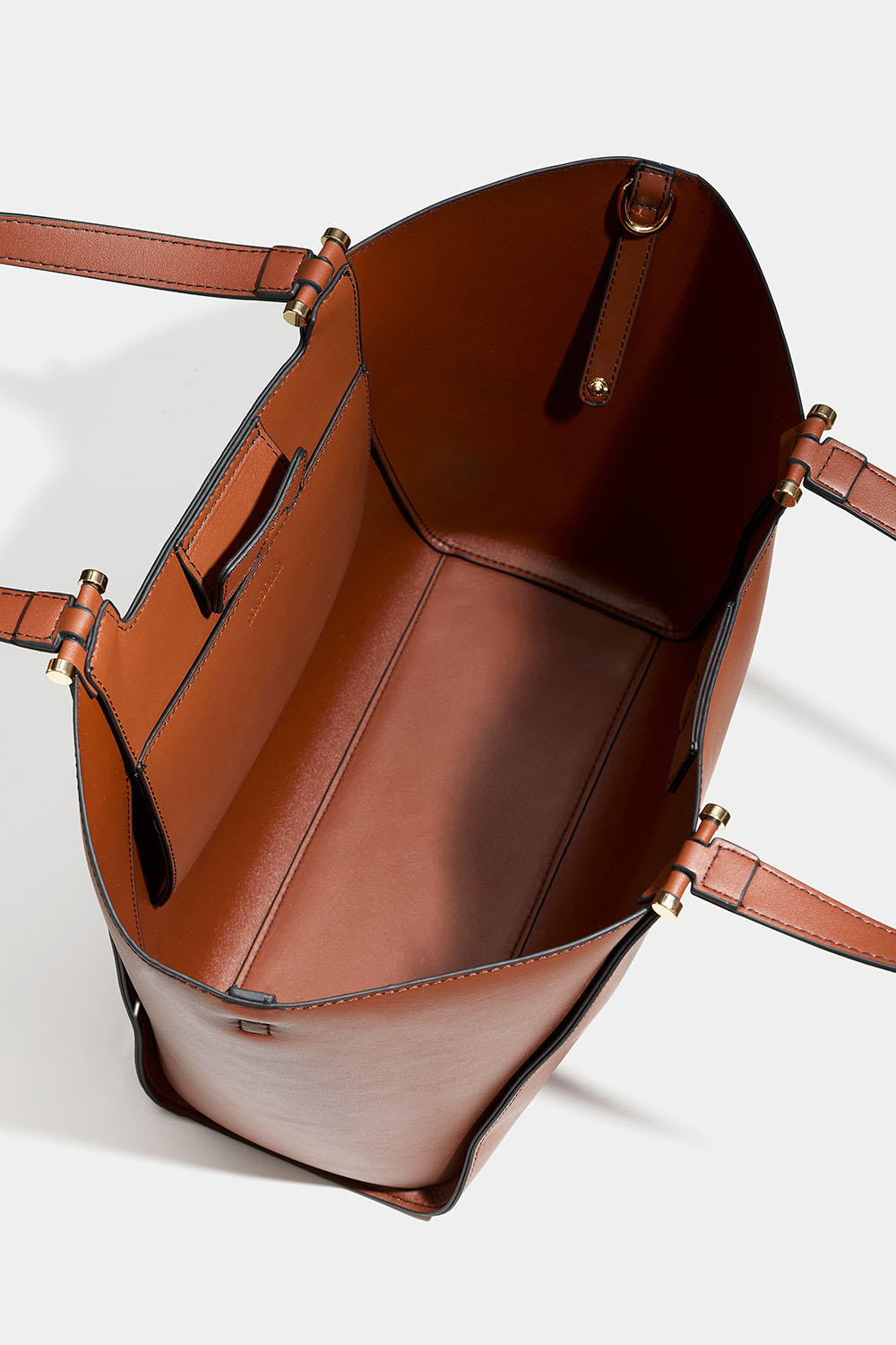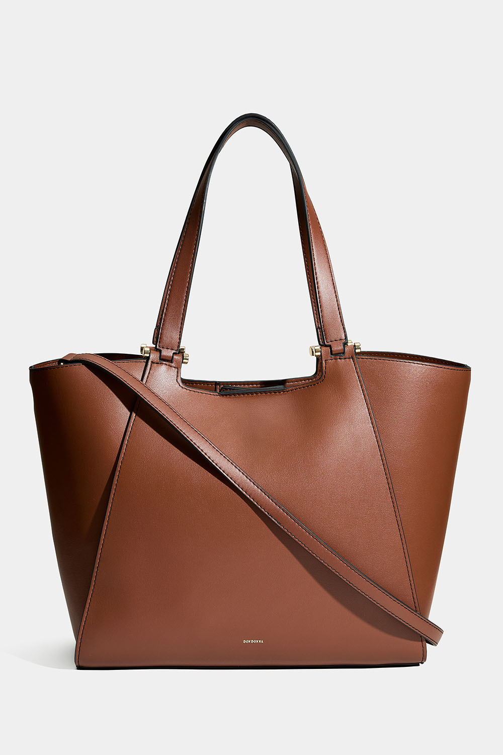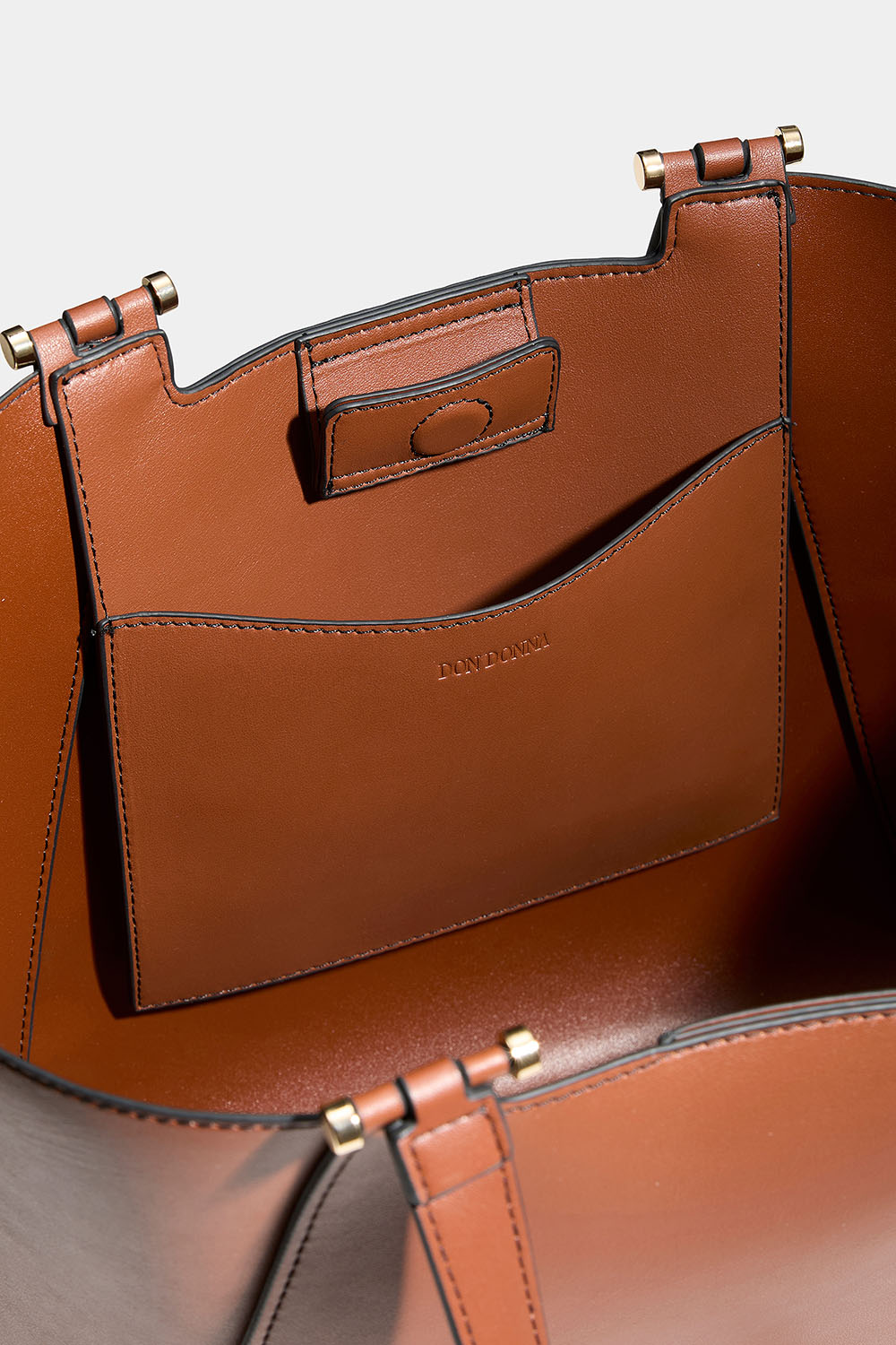 Brun tote bag från Don donna i läderimitation. En stilren väska med dubbla smala handtag och en avtagbar längre axelrem. Väskan har ett stort fack so mman kan välja att knäppa ihop sidorna av väskan för en smalare passform.
