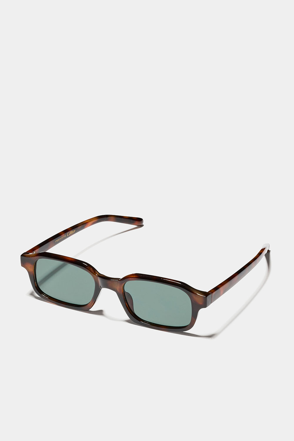 Bruna stilrena solglasögon med smala rektangulära bågar.