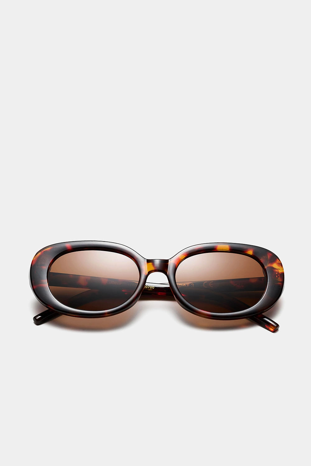 Bruna ovala solglasögon med tortoisemönstrade bredare bågar. Ett par stilrena solglasögon som passar till alla soliga tillfällen.