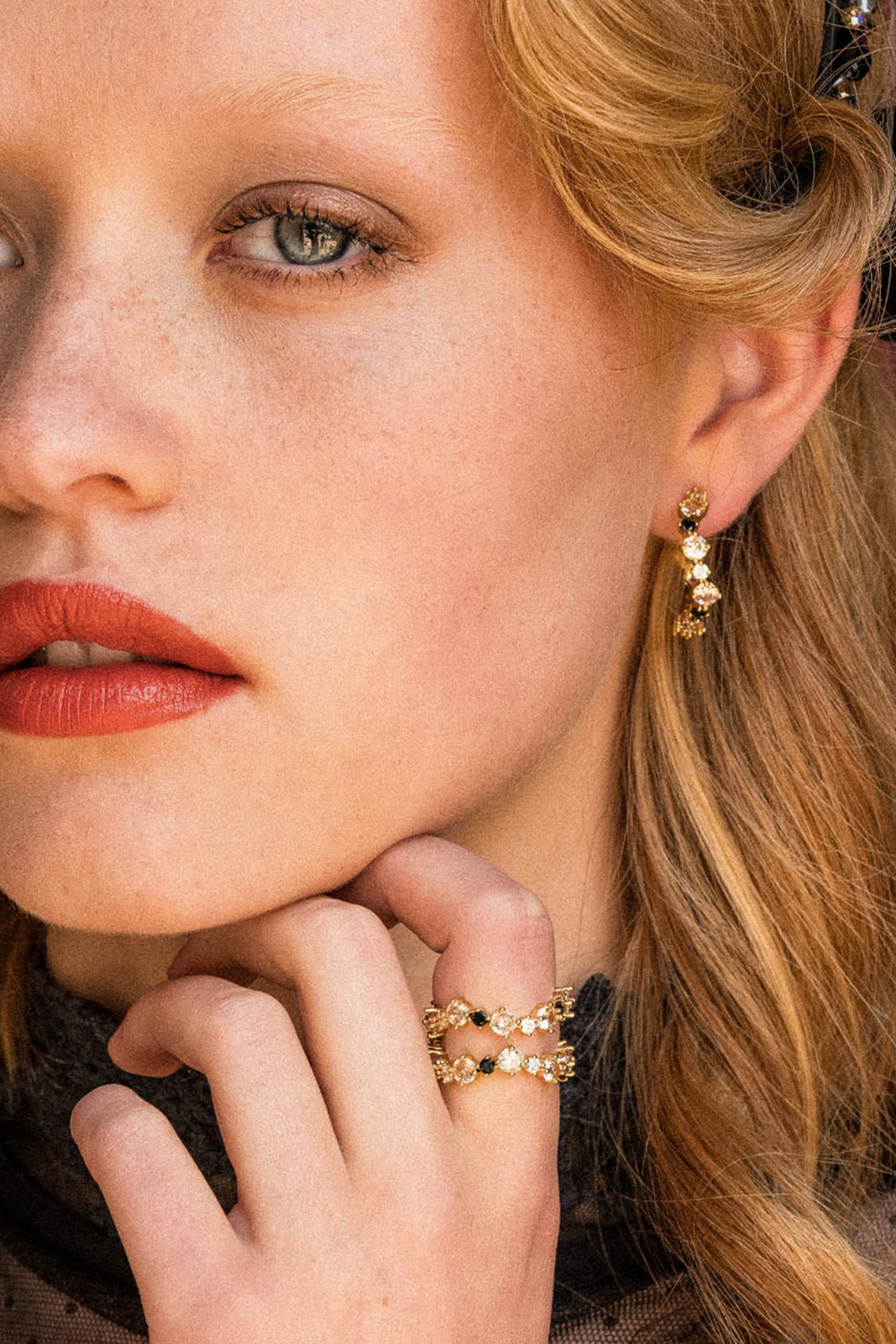 The Celine Ring features sparkling champagne-colored stones paired with bold black accents, creating a look that is both timeless and modern.