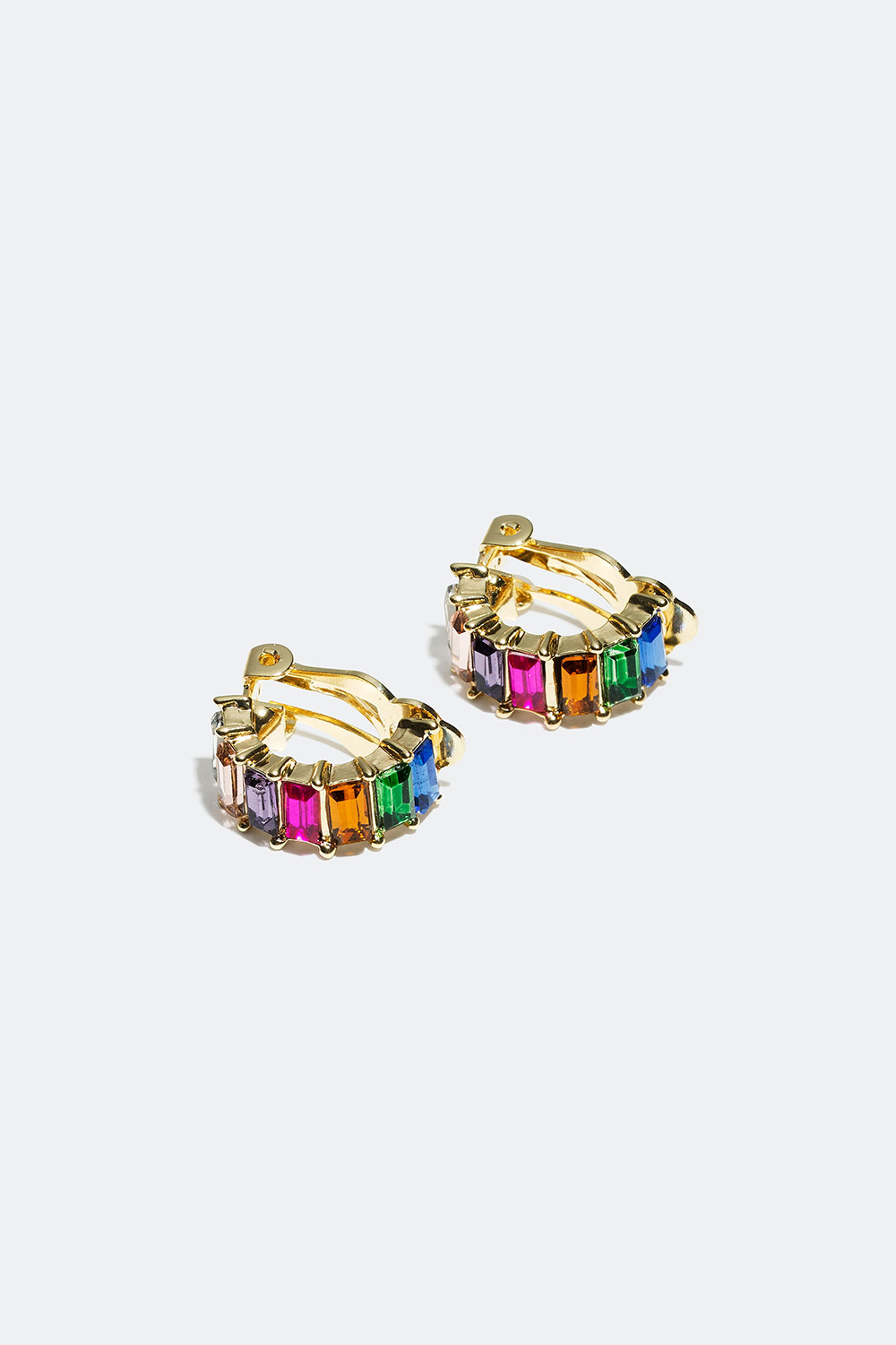 Guldfärgade clipscreoler som är dekorerade med baguettestenar i olika färger.