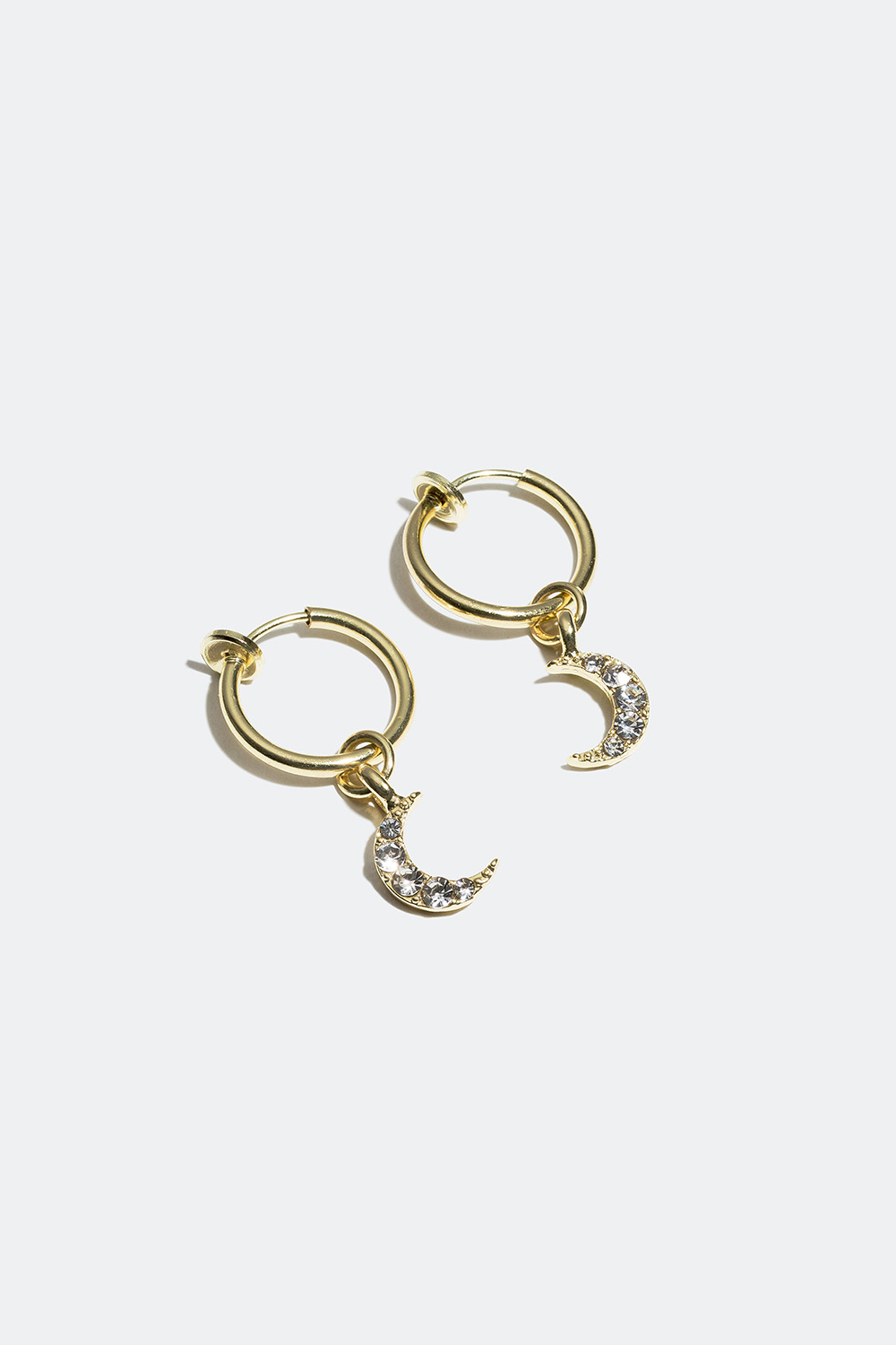 Guldfärgade clipscreoler med en måne som är dekorerad med små gnistrande stenar. Perfekta för dig som inte har hål i öronen och letar efter ett par enkla men dekorativa örhängen.