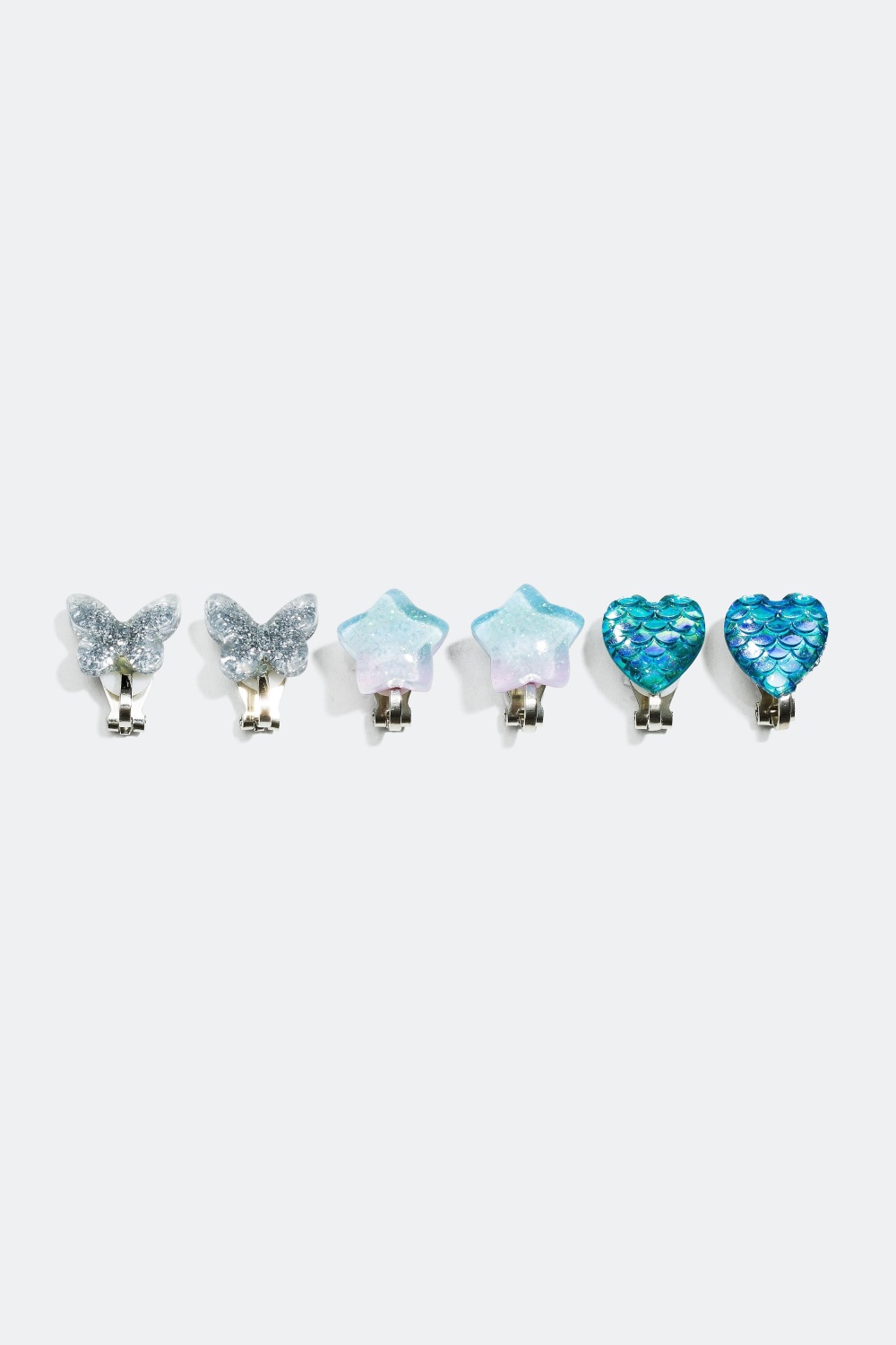 Clipsörhängen med fjäril, stjärna och hjärta, 3-pack - Flerpack clipsörhängen i metall. Ett par har formen av en glittrig fjäril, ett par är dekorerade med en glittrande stjärna och ett par har formen av ett hjärta.