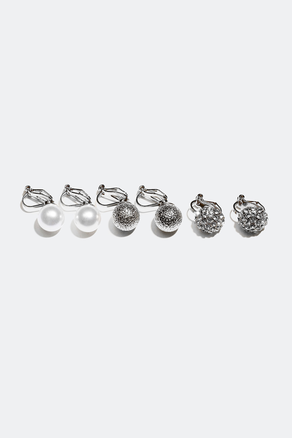 Tre par runda clipsörhängen. Ett par dekorerade med flera små strasstenar, ett par i mönstrad metall samt ett par vita pärlörhängen. Örhängena kommer i både silver- och guldfärgad metall.