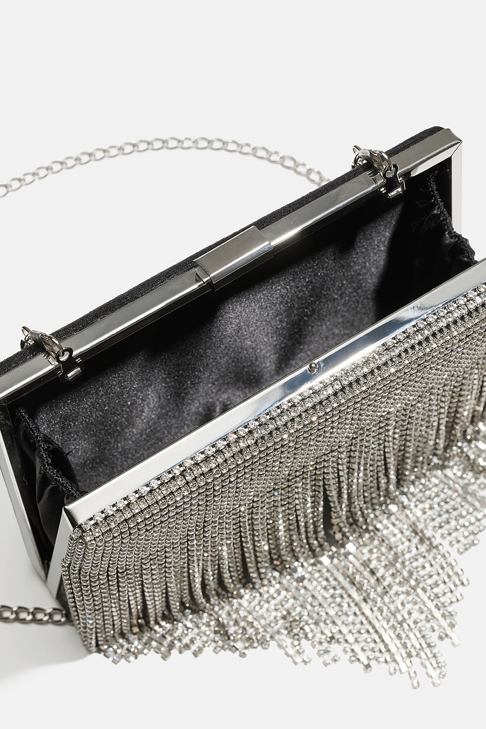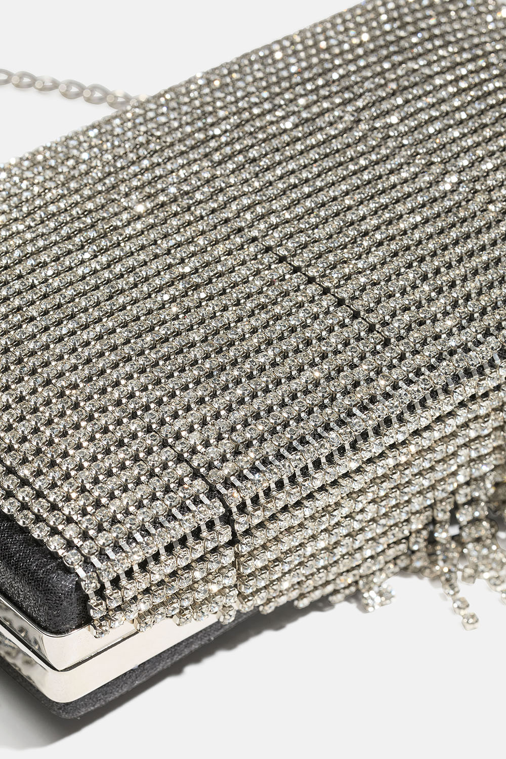 Hård clutch i svart tyg med hängande strasslänkar. Väskan öpnas med ett spänne och det medföljer en avtagbar kedjerem.