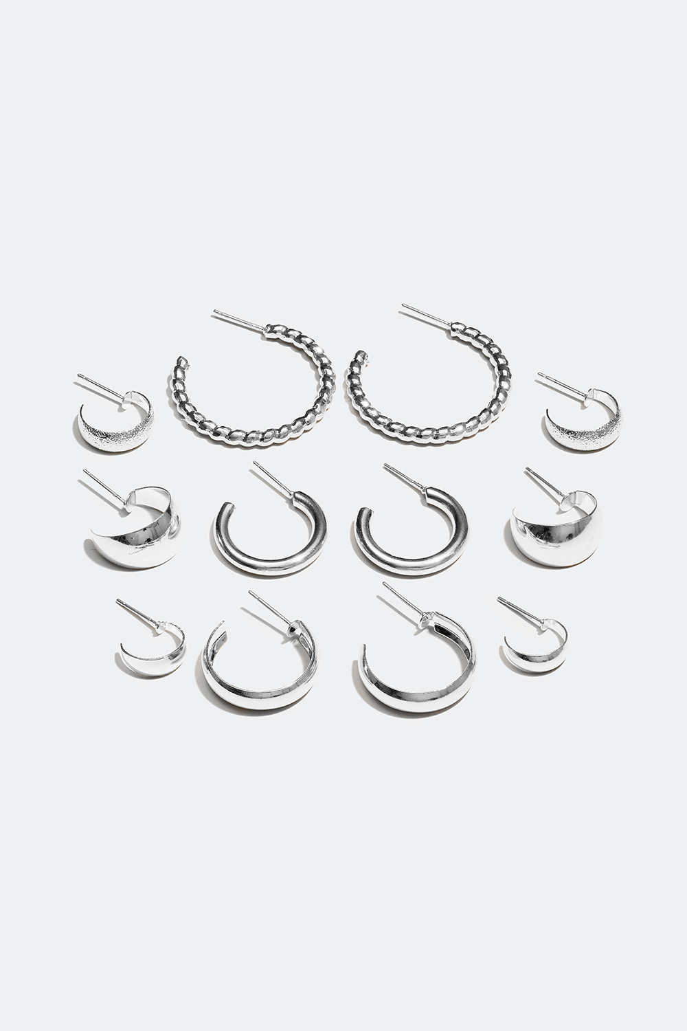 Sex par creoler i silver- eller guldfärg i olika storlekar och ytor såsom slät och strukturerad yta eller vridna mönster.