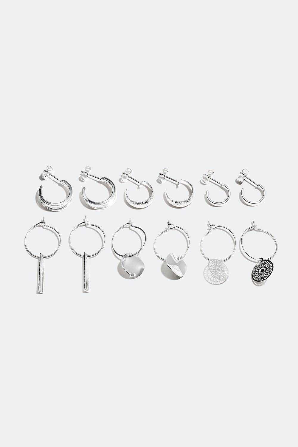 Sex par hoops med olika designs. Ett par mindre klassiska, ett par med strukturerad yta, ett par som dubblad hoop, ett par tunna med hänge av rektangulär stav, ett par tunna med hänge av rund, hamrad platta samt ett par tunna med hänge av en mönstrad rund platta.