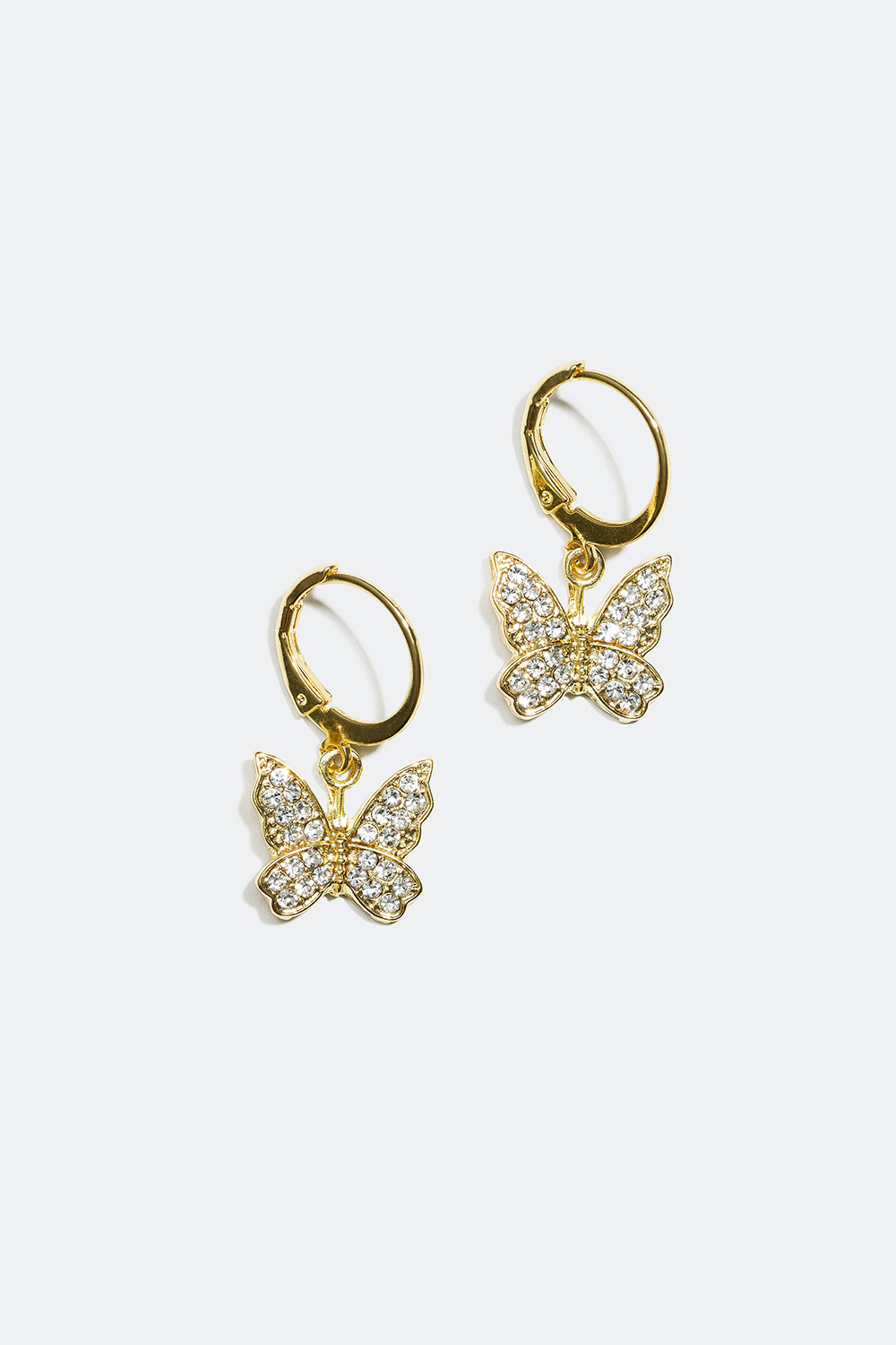 Små creoler ett gnistrande hänge med ett fjärilsmotiv av glasstenar.
