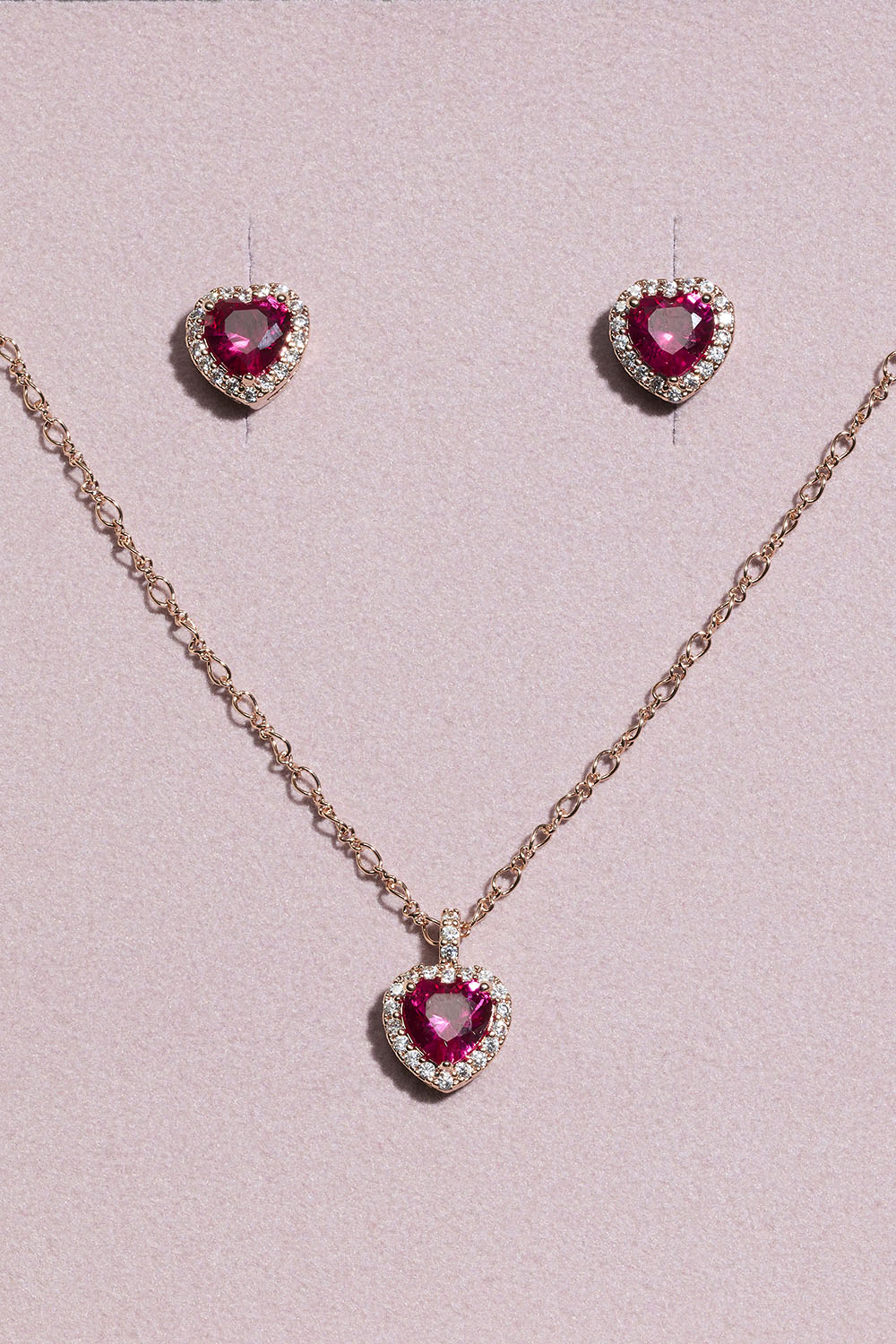 Hot pink is having its moment this year and what better way to celebrate than to adorn a pink ruby heart with dainty clear crystals. Add a pop of colour to your look with these sweet, eyecatcing, studs and necklace set in rose gold.