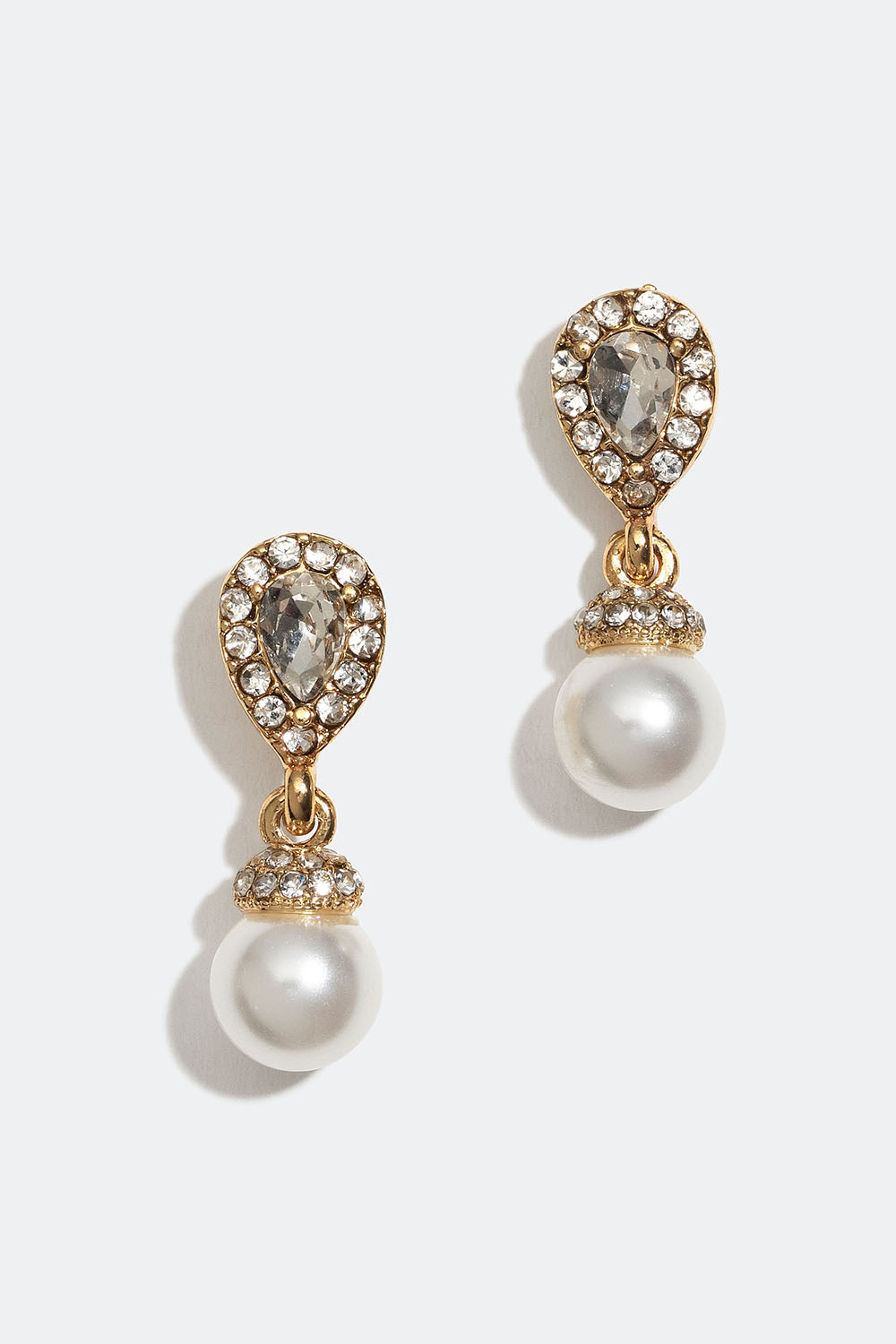Droppformade örhängen i guldfärgad metall som är utsmyckade med skimrande glasstenar och vita glaspärlor.