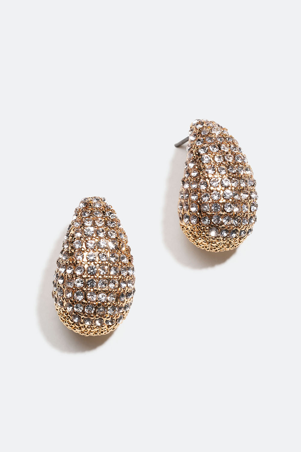 Droppformade örhängen i guldfärgad metall dekorerade med glasstenar. Ett par skimrande örhängen som passar perfekt till festliga tillfällen.