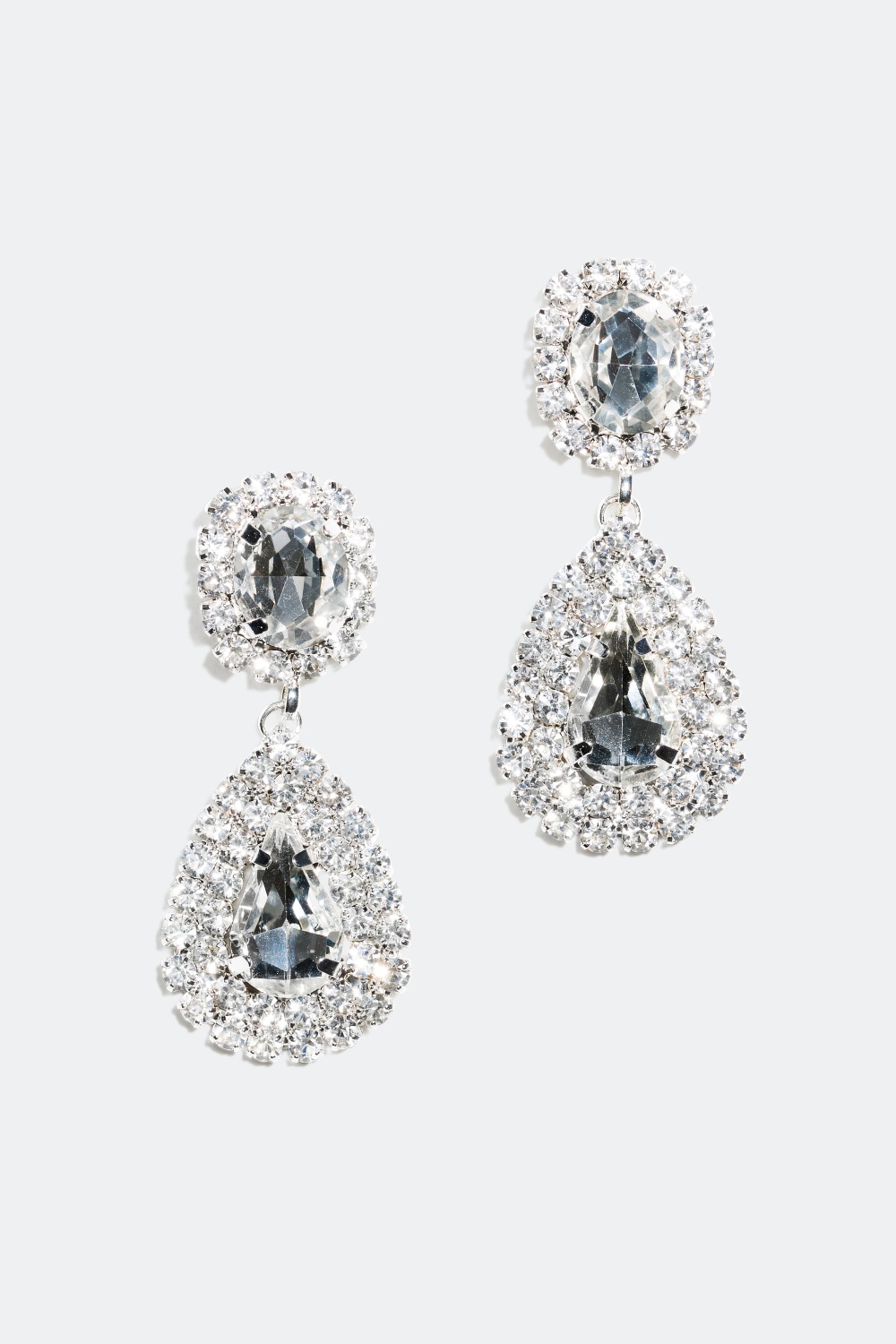 silverfärgade statement örhängen formade som en droppe. Smycket är dekorerat med små glittrande stenar av glas.