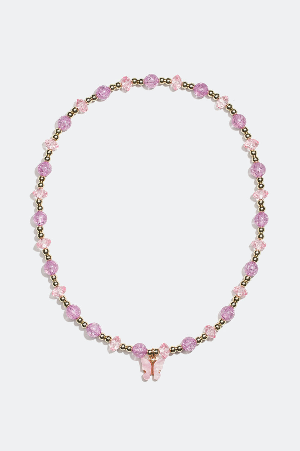 Elastiskt halsband med rosa och lila pärlor och ett fjärilshänge i rosa färg.