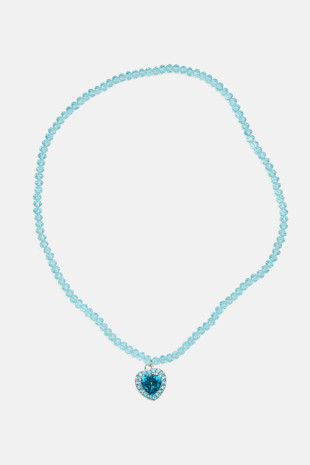 Elastiskt halsband för barn med blåa glaspärlor och hjärthänge i metall dekorerad med glasstenar.