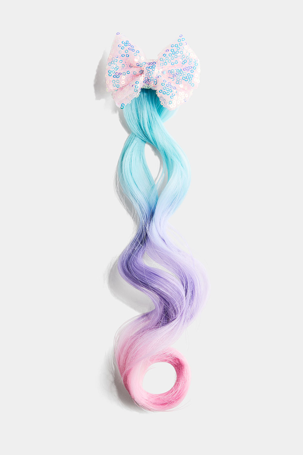Syntetiskt löshår i rosa, lila och blått, på en rosa rosettklämma täckt av paljetter.