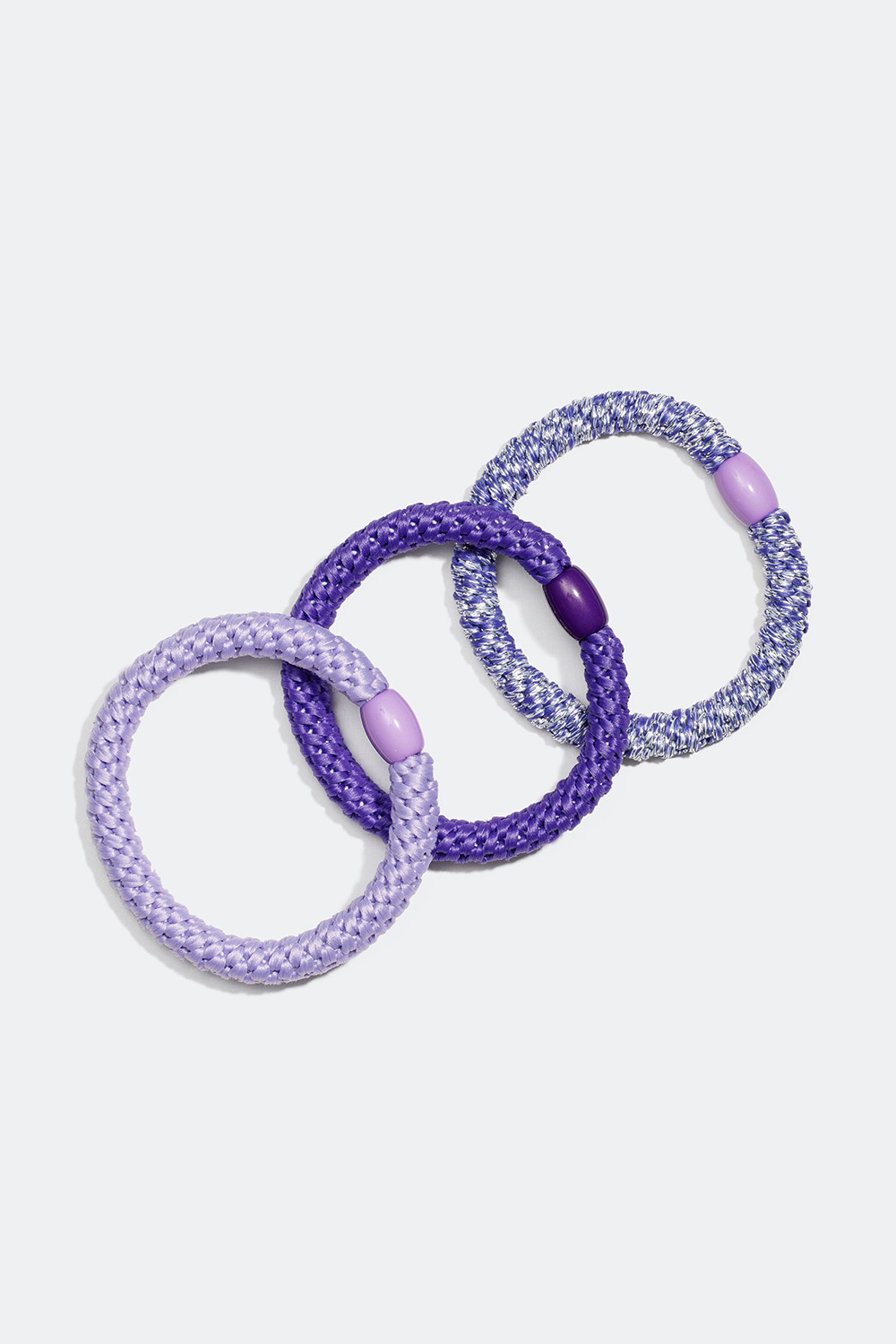 3-pack kraftiga hårsnoddar i en mix av lila färger i olika nyanser med en pärldetalj i matchande färg. Dessa tofsar är hopflätade av små resårsnoddar, vilket gör dem extra elastiska och mycket skonsamma mot håret. När du inte använder dem i håret så är dem fina att bara ha runt armleden.